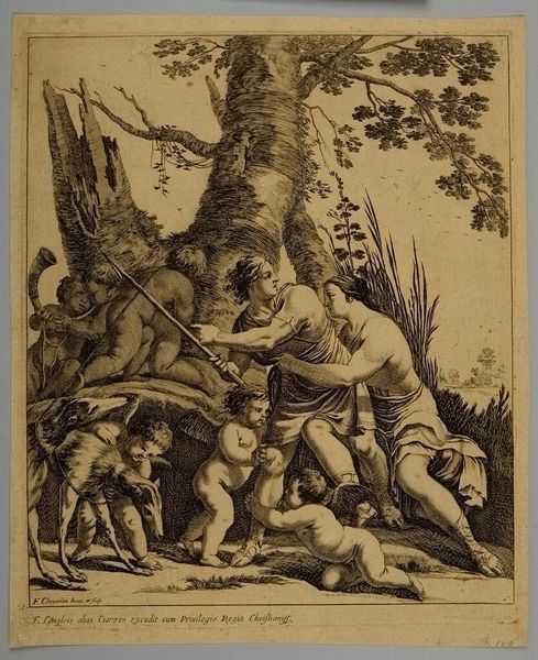 Curator: This print, titled "Apollo Pursuing Daphne," is by an anonymous artist. Look at the frantic energy! Editor: It's all in the chase, isn't it? The way the lines create the illusion of movement, the implied narrative of desire and escape – the materiality of the printed line becomes a vehicle for the story itself. Curator: Exactly. Prints like these circulated widely, shaping popular understanding of classical myths. Think about the social context: prints democratized art, moving images beyond the elite. Editor: Absolutely. This very act of production—the plate, the press, the ink—facilitated that transformation. The labor involved, the accessibility of the image… it's a whole different consumption model than a unique painting. Curator: And considering the context of the print, it's not just about the myth, but also about societal power structures and the male gaze. Editor: So, in its dissemination and consumption, a seemingly straightforward mythological scene becomes a vehicle for exploring societal values and power dynamics. Curator: Precisely. An intriguing lens through which to view art's broader social impact.
