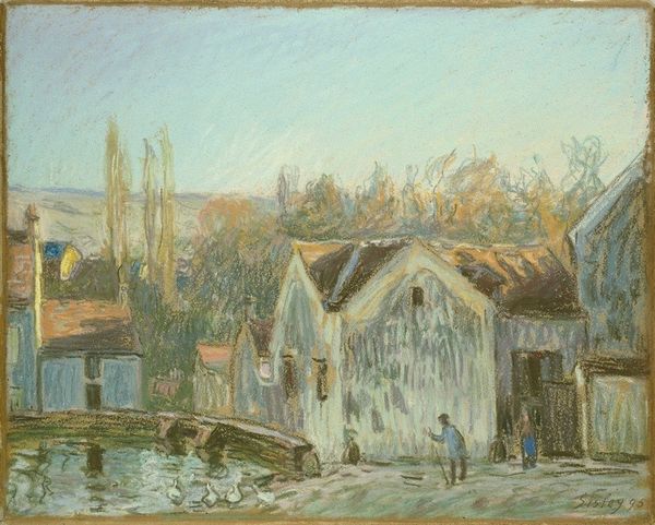 Curator: The soft hues lend a quiet, pastoral air to John Singer Sargent's watercolor, "Cottage at Fairford, Gloucestershire," painted in 1892. Editor: It gives the impression of having been dashed off quickly, almost as an aside. But those washes, layered as they are, create a substantial structure out of a modest subject. I'm struck by its intimate scale. Curator: Indeed. The immediate impression is of the formal arrangement: observe how the strong diagonal thrust of the roofline divides the composition, and how the vertical tree trunks to the right serve as compositional anchors, framing the scene. Editor: And the layered watercolor itself, pooled and bleeding in places, speaks to a fascination with process. Sargent’s rapid application and blending, indicative of en plein air work, highlights the environmental conditions—humidity, light—that would impact the pigment as much as the subject itself. Curator: Precisely! Consider how Sargent has used the translucency of the watercolor medium to build up tonal variations, creating depth and form with minimal brushstrokes. The negative space becomes as crucial as the pigmented areas, animating the architectural structure. Editor: You can practically feel Sargent grappling with how to represent labor, the very act of translating this reality into marks. The swift strokes embody that process, more interested in feeling the landscape than perfecting a mere depiction. Curator: Absolutely. And through his compositional choices, we get a carefully considered interpretation of architectural and landscape forms in conversation. What do you make of that color choice? The juxtaposition of warmer and cooler tones creates a gentle vibration across the picture plane. Editor: This, I think, reveals Sargent not just capturing Gloucestershire, but working, really working, with his tools. Every brushstroke is the residue of a decision about representation, a quiet commentary on how we, as humans, engage in the making and consumption of images of labor and home. Curator: I appreciate the attention given to the dialogue between materials and structure. The dynamism it suggests allows me to consider my own process when decoding the piece. Editor: For me, viewing Sargent wrestle with technique underscores how fundamentally social his art practice must have been, situated amid the forces of production and environment.