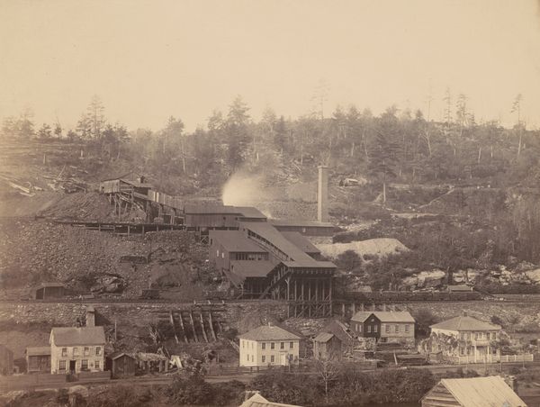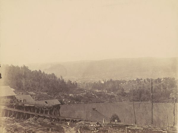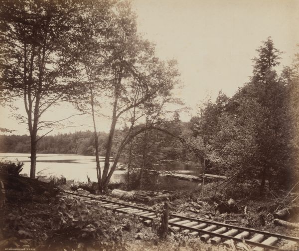 Editor: So, this is "On the Moosic, East, Del. & Hudson Canal Co." taken by Thomas H. Johnson sometime between 1863 and 1865. It's an albumen print. There's something haunting about it. I'm curious – what stands out to you? Curator: Immediately, I see a crossroads – visually, yes, with the converging tracks, but also symbolically. Notice the skeletal tree standing starkly amidst the living pines. It acts almost as a memento mori, a reminder of mortality, particularly potent in the context of a landscape undergoing industrial transformation. Editor: The tracks leading toward the town certainly feel like progress, but you're right, the dead tree adds a layer of unease. What else can we read in the photograph? Curator: Think about what the canal represents – a deliberate reshaping of the natural world for commerce. Then, look at how Johnson frames it. The image isn’t simply documenting progress; it’s subtly commenting on its impact. See how the cleared land seems to expose a rawness beneath the surface, contrasting with the romanticized landscapes typical of the Hudson River School. Editor: So, the photo is both an objective record and a cultural statement. Curator: Precisely. The symbols point to broader narratives about industrial ambition, its environmental cost, and the enduring presence of nature. Ask yourself, is this image a celebration, a lament, or perhaps something in between? Editor: I didn't see it that way at first glance, but now I understand the tension Johnson captures. Curator: Visual symbols can speak volumes when we start to unpack them. There's often more than meets the eye, prompting reflection and further exploration of history through the language of images.