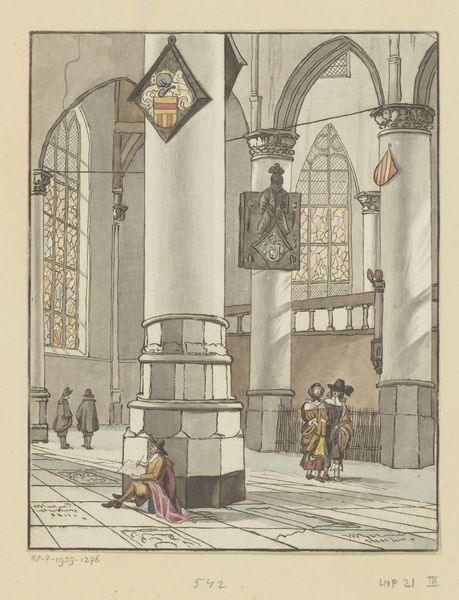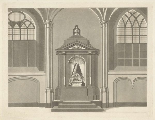 Curator: Jan Baptist Tetar van Elven created this engraving between 1831 and 1833, it is titled "Monument voor Jan Carel Josephus van Speijk". Editor: The print is rendered in very cool greys, almost ashen in quality. The composition centers a monument but it feels overshadowed by the vast architecture surrounding it. Curator: Yes, notice the meticulous engraving work to achieve that sense of scale and depth. Van Elven was very concerned with precision. Considering the labor involved in engraving those intricate lines for architectural accuracy tells us much about 19th-century printmaking's role in documenting and disseminating cultural and political narratives. Editor: I see how the crisp lines give a feeling of stark grandeur. Speaking of narratives, the historical context is quite complex here, isn't it? Jan van Speijk was a controversial figure in Dutch history, to put it mildly. His act, while seen as heroic by some, represents a very charged moment of colonial power. Curator: Absolutely. Consider the means by which images of figures like van Speijk circulated. These engravings like the monument itself became tools for constructing a certain national identity in post-Napoleonic Netherlands. We should also remember that printmaking enabled these heroic images to spread widely, molding popular opinions. Editor: It's intriguing to consider this in light of our own contemporary visual culture. What gets memorialized, how, and by whom – it’s all part of an ongoing conversation about historical narratives, especially in the face of the difficult legacies of colonialism. Even the decision to depict the monument within a massive church space underscores that this commemoration is tied to institutional power. Curator: Precisely. Examining such imagery compels us to question whose labor and stories were left out of this official historical record, whose voices were amplified by these engravings, and the underlying systems that sustained those choices. Editor: Definitely gives you pause, doesn’t it? Curator: Indeed. Looking closer helps us to ask the crucial questions around its making and lasting influence. Editor: Right, to see beyond the surface, as it were.