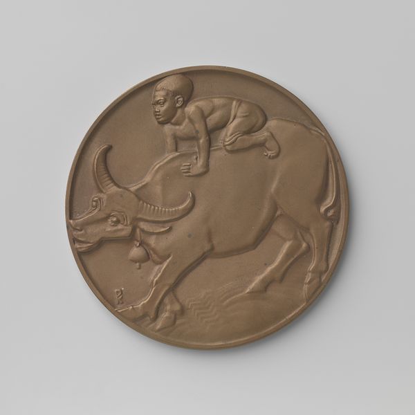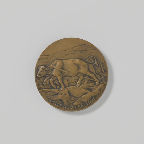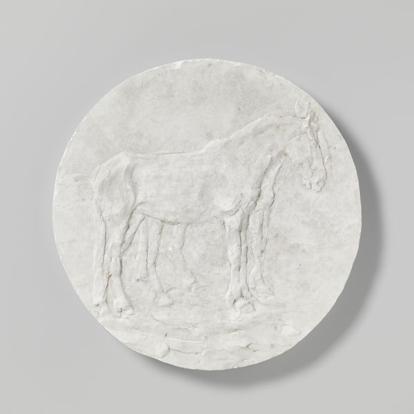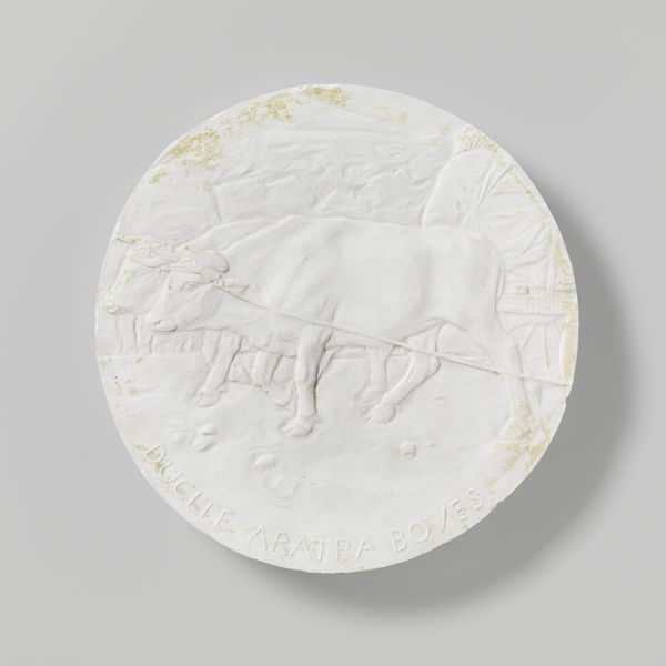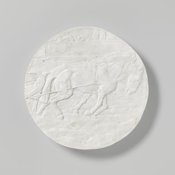 Lambertus Zijl made this plaster plaque, a design for a medal, with its team of draught horses and the inscription "SIC VOS NON VOBIS," sometime in the early 20th century. You can see the hand of the artist so clearly here in the rough, unpolished texture of the plaster. It’s a piece about process, about the labor of making as much as the labor of the horses. The surface is a shallow relief, so the image feels almost ghost-like. The forms are there, but they're subtle, emerging from the ground like memories. Look closely at the horses; you can almost feel the weight of them, pulling, straining. That phrase, "SIC VOS NON VOBIS" - it means "Thus do you labor, but not for yourselves." It adds another layer, a kind of melancholy, like a memento mori. It reminds me a bit of Rodin, that same interest in the body, in movement, in the weight of existence, but with a quieter, more domestic feel. This piece embraces ambiguity, inviting you to bring your own thoughts and feelings to it.