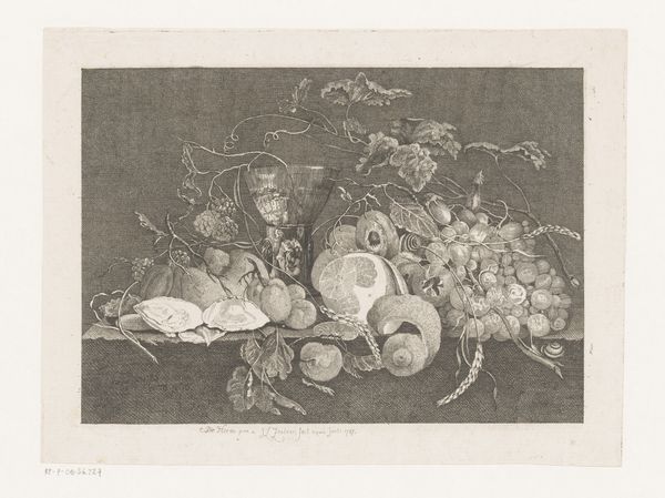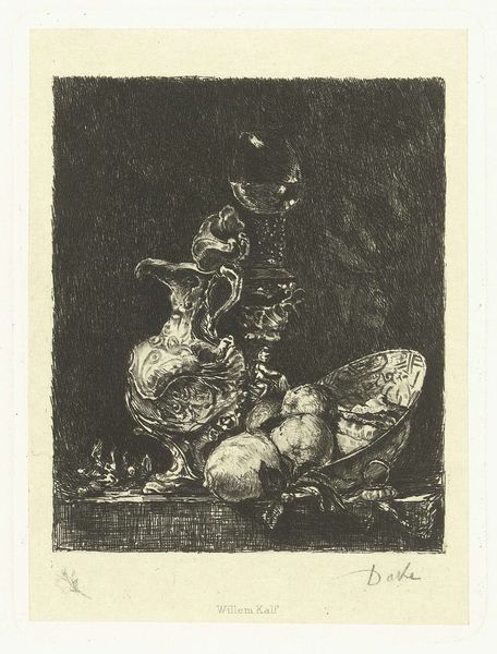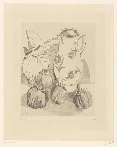 Curator: Welcome. Today we will be discussing Kees Stoop’s “Knooflookstreng,” a compelling etching dating roughly from 1944 to 1990, held here at the Rijksmuseum. Editor: My initial impression is one of rustic simplicity, even melancholy. The stark monochrome and dense lines give the garlic bulbs a weighty, almost mournful presence. Curator: Indeed, Stoop’s technique here is crucial. The linearity of the etching, that distinct style of cross-hatching and tight mark-making, shapes and defines each bulb and root, creating a complex texture with purely tonal variation. Editor: It makes me wonder about Stoop’s artistic intention in that time period, though. These are, after all, wartime and immediate post-war years; a seemingly simple depiction of garlic might be an index for sustenance, endurance, or even protection amidst turmoil. Do you think there is some political symbolism present? Curator: While such interpretations are possible, I remain fixed on the aesthetic impact and effect of his etching technique. The emphasis on line and tone in this rendering of everyday objects aligns neatly with formalist artistic concerns during and after the war, and indeed throughout much of the century. Editor: But can we disregard context? These ordinary foodstuffs held and still hold particular cultural significance tied to class, rural life, and identity, which complicates a purely aesthetic assessment. It is important to understand its possible significance at a period of rationing and upheaval for many. Curator: It could be argued that such socio-political readings depend heavily on speculative biographical linkages that cannot be fully verified. Editor: True, and yet I cannot help seeing the piece as resonating with broader societal tensions regarding the return to normalcy following times of duress and economic depression. Curator: An intriguing thought. Viewing "Knooflookstreng" through diverse lenses deepens our engagement and interpretation, regardless of intent. Editor: Exactly! The print reminds us that everyday life is still charged with social and cultural meaning.