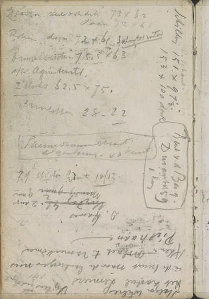 Curator: This drawing is called "Annotaties," made around 1900 or 1901 by George Hendrik Breitner. It’s pencil on paper and currently resides here at the Rijksmuseum. Editor: It's almost like a visual stream of consciousness! The handwriting, the seemingly random lines... it feels incredibly intimate, like we’re peering into Breitner's private thoughts and maybe even financial annotations with prices listed on the top right. Curator: Precisely. Breitner's work, heavily influenced by Impressionism and the Dutch Golden Age, often blurred the lines between public and private spheres. The drawing serves not only an aesthetic purpose but also represents a glimpse into everyday life, economics of studio materials, addresses, or possibly names of people whom he interacted with at that period in Amsterdam. Editor: I'm struck by the contrast between the relatively ordered layout and the hurried nature of some of the writing. It makes me think about the social and economic position of artists, even successful ones like Breitner, navigating their daily life. This seems like a shopping list but, it doesn't read like a simple set of notes - these fragments have an intimacy. I wonder what are the artist’s intentions, even at the time. Curator: That's an interesting interpretation. I agree that it raises important questions. His engagement with portraying everyday urban life – often considered to be less conventional and "idealized" – allows his drawings such as these to give space to reflect upon aspects of identity or economic circumstances prevalent during his lifetime in Amsterdam. Editor: Exactly. It encourages us to think about those aspects, to consider how even something as seemingly simple as annotations becomes laden with contextual and cultural meaning. Are these throwaway sketches or something to be saved as a memento? The artist leaves that decision to the viewer. Curator: Ultimately, "Annotaties" is both an intimate snapshot and a product embedded in its social moment. This juxtaposition provides a lot to discuss from multiple lenses. Editor: A poignant reminder that the everyday is, indeed, inherently political and an art piece itself. It makes one re-think all the information, all the images we gather as art every day of our lives.