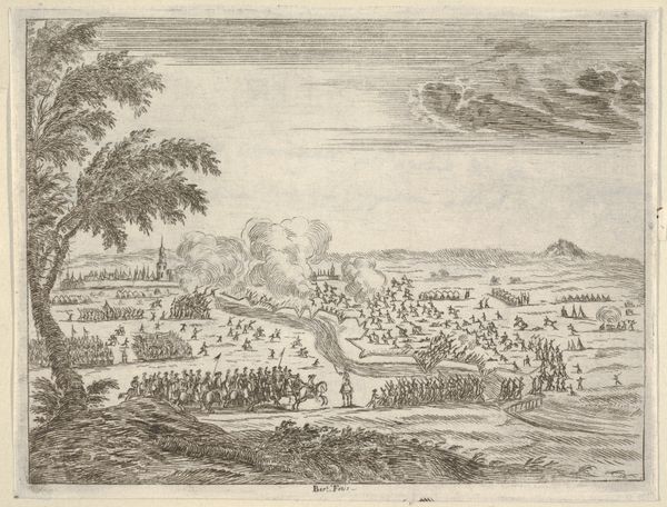 Bartolomeo Fenice created this print titled, 'Francesco d'Este Leads the French Army...' The etching presents a landscape dominated by linear precision and a stark contrast between the detailed foreground and the expansive background. The composition is structured around the receding perspective, drawing the eye from the commanding figures in the front to the distant conflict near Cremona. This structured recession not only gives depth but organizes the narrative, emphasizing the Duke's leadership amidst chaos. The artist employs line work to define forms. Notice how the dense lines in the lower left and right create a sense of mass, while the sparser, fainter lines create the illusion of distance. The plume of smoke rising from the battle is rendered with swirling lines, in contrast to the rigid lines of the soldiers, and introduces an element of dynamism. Fenice uses the structured composition to deliver a clear message, which is common in propaganda.