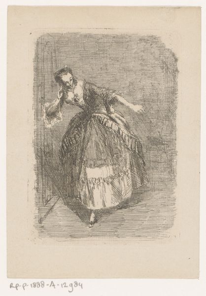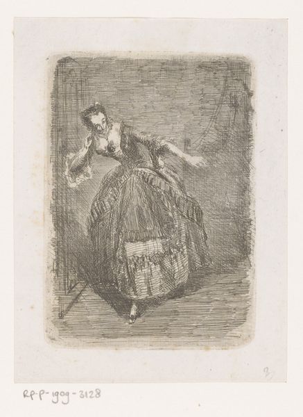 Curator: Florent Nicolas Crabeels' "Marketentster," an etching that probably dates somewhere between 1839 and 1879, presents a solitary figure, seemingly paused in motion. It's deceptively simple, yet intriguing. Editor: Immediately, I see a strong sense of movement, a spirited energy captured in those etched lines. The woman almost seems to be dancing, though her expression has a hint of defiance. Is there perhaps a deeper commentary being suggested here? Curator: Absolutely. Marketentsters, like the one Crabeels depicts, occupied a unique space in the 19th century—usually women, often partners of soldiers. They were both integral to and outside of military structure and culture, and frequently occupied ambiguous social and economic positions. Editor: Ah, the ambiguity is visible! I see she carries what appears to be wares for sale. The basket hanging on her front almost has the appearance of weaponry strapped for war. The hat she is wearing appears ostentatious, while her clothing suggests practicality, a working woman perhaps down on her luck? What sort of symbols and attire are we to understand in the greater meaning? Curator: I think the dress challenges notions of gender and labour in a period of conflict. The marketentster becomes a visual embodiment of blurred boundaries – between civilian and military, labour and leisure, woman and soldier. Editor: Her eyes lock with ours. Is the artist making a deeper social commentary? What did he hope the audience would feel? Curator: We can consider Crabeels working at a moment when genre paintings became increasingly interested in revealing underlying power structures, giving greater social meaning. Her confident gaze suggests a woman who refuses to be simply defined or dismissed by any single label. Editor: So Crabeels provides the woman, rather than simply an ornamental figure, with layers of personality? Curator: Precisely. And the lack of specific context beyond the single figure compels us to reflect more on who is making it so and what is that audience supposed to understand. It highlights the historical complexities that were impacting women in the marketplace in those times. Editor: It gives pause, indeed! There's a story in those eyes, a story that shifts depending on how you interpret those symbols of identity. Curator: Well said! I agree. Examining this work gives me greater appreciation for the artist, as well as this historically significant and ever evolving archetype.