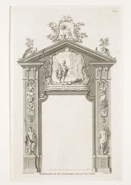Editor: Here we have Melchior Tavernier's engraving from 1629, depicting a Triumphal Arch. It's meticulously detailed, and almost feels like a stage set for a historical drama. I'm curious, what socio-political narratives do you see embedded in this triumphal arch? Curator: That's a fantastic question! Triumphal arches, historically, were potent symbols of power and dominance. Tavernier’s engraving, made for King Louis XIII’s celebratory procession into Paris, wasn’t merely about aesthetic glorification. It functioned as propaganda, solidifying the monarchy’s authority in a city often resistant to royal control. Consider how classical architectural elements are employed; do you see any visual cues to understand the values the monarchy is trying to project? Editor: Definitely the Roman-style columns and the allegorical figures. Is it meant to link the French monarchy to the Roman Empire, projecting an image of strength and permanence? Curator: Precisely. And what about the imagery in the panels adorning the arch? Note the inclusion of Justice and Religion, common figures within royal iconography. In that sense, the arch isn’t simply about military triumph. It's projecting Louis XIII as a divinely ordained ruler, entrusted with the welfare of his people. It also excludes any counter-narratives or alternative perspectives of those excluded from such celebrations. Do you find it compelling? Editor: It’s fascinating how carefully crafted it is to convey such a specific message. You realize how much power images held in shaping public opinion. Looking at it from today, I'm now thinking who are the people that aren't included or excluded from this image. Thanks for the new perspective. Curator: It shows how much a picture is worth a thousand stories that sometimes needs to be retold, not from one side but all angles, so our understanding of history is more nuanced.