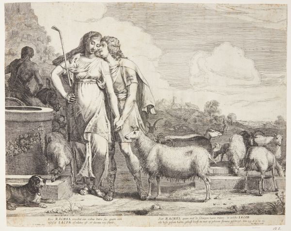 Curator: Immediately, what strikes me is this overriding sense of naïve optimism. The composition is quite unusual—a cluster of animals juxtaposed with this dense group of figures, all radiating serenity despite being a rather unnatural grouping. Editor: This is "Peaceable Kingdom" by Edward Hicks, completed around 1830. Hicks was an American folk painter and a Quaker minister, and he returned to this allegorical scene many times throughout his career. It’s oil on canvas. What’s especially intriguing is the way he combines religious ideals with his own observations of American life and the fraught relationships that were, and are, omnipresent. Curator: Absolutely, it’s that synthesis of spiritual yearning and earthly observation that I find compelling. Take the lion, for example, nestled beside the lamb – the artist clearly pulls from Isaiah's vision of a restored world, one where predator and prey exist in harmony. Editor: Right, the specific verse from Isaiah 11. And not only does it reflect utopian desire but also acknowledges historical reality through its complex figures on the left. It alludes to William Penn’s treaty with the Lenape people, framed with the banner “Peace on Earth,” however, the artist also wrote the phrase "all men except the Africans" which raises concerns about the inherent inequalities of even so-called peace treaties, like the historical oppression of Native Americans alongside the enslavement of African people. Curator: A powerful point about the exclusionary nature of early American ideals. I hadn't quite made that connection, but it seems quite pointed. As I reflect on it, it infuses the overall image with complexity, challenging its initial sweetness. It acknowledges a painful reality. Editor: And what resonates deeply with me is Hicks's personal struggle with worldly affairs and the Quaker ideal of inner peace. The "Peaceable Kingdom," therefore, isn't a passive ideal, it serves as an urgent prompt—an imperative toward dismantling systemic violence and working toward genuine peace, inclusive of all, not in spite of those actively discriminated against. Curator: Well, your reading helps to see just how much is held within what might be a superficially placid image. The personal and the political so vividly present! Editor: Agreed. Hicks delivers a symbolic, timeless vision, albeit one burdened with an important challenge toward creating peace.