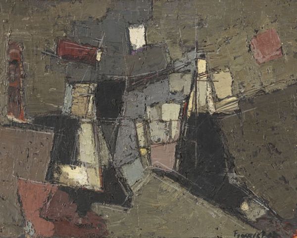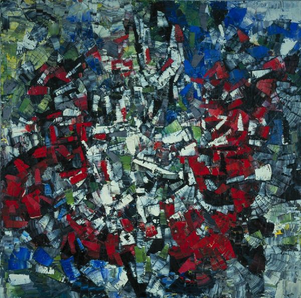 Natalia Dumitresco made "Après-midi de printemps" with paint, and, I imagine, a whole lot of feeling. The overall effect is of a mosaic, built up from small units of pigment, all dancing around a central cluster. Look at how she lays down the paint. It's not about blending or finesse; it's more about this direct, almost urgent application. Thick strokes of red and gray crash into each other, creating a surface that's alive with texture. You can almost feel the energy of the artist’s hand as she’s wrestling with the canvas. It's like she’s trying to capture something fleeting, a memory or a sensation. And those little marks, scattered throughout the painting, they remind me of Joan Mitchell's chaotic brushstrokes, but here, they're more contained, almost architectural. Dumitresco is part of a long lineage of painters who aren't afraid to get their hands dirty, who understand that painting is as much about the process as it is about the final image. It's a conversation, a negotiation between the artist and the material.