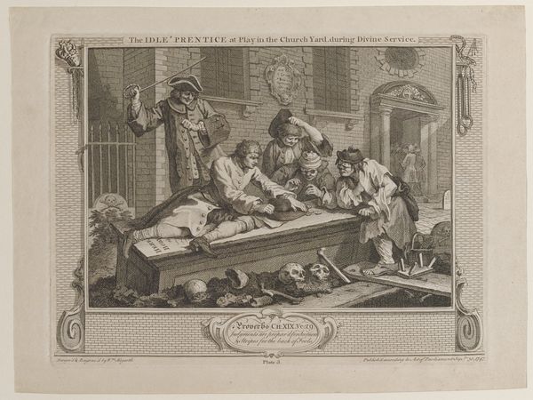 Curator: Alright, let's dive into this intriguing print, "Wachtlokaal met apen," or "Guardroom with Monkeys," created around 1720 by Matthijs Pool. It's an engraving that's just teeming with...well, monkeys! Editor: My first impression? It's like a chaotic party in a dimly lit pub—except the guests have delightfully mischievous faces and surprisingly long tails! There’s a theatrical quality to it that draws me in. The contrast between light and shadow amplifies that, right? Curator: Absolutely. Pool's known for his narrative genre scenes, and this one is particularly fascinating because he's taken the concept of the "singerie" - where monkeys mimic human behavior - to quite a literal and, dare I say, political extreme. It's set in a guardroom, a place of supposed order and authority, but it is entirely populated by these unruly apes. Editor: It screams social commentary, doesn't it? Putting monkeys in positions of power... I mean, are we to read this as a satire on the follies of governance, or perhaps the aristocracy's detachment from the populace? It resonates even today, this portrayal of leaders lost in their own game, blind to genuine responsibility. Curator: It's quite possible. I always interpreted it more as an expression of societal chaos; like what would happen to us humans in a social structure gone sideways. Monkeys doing human things just turns silly real fast. I wonder about Pool's personal feelings when composing this print. What was he laughing at, exactly? Editor: Perhaps he wanted us to contemplate our own "animal" natures. Think about the era – the Enlightenment was dawning, challenging long-held beliefs. By depicting monkeys behaving like humans, he might be prompting reflection on what truly differentiates us, and if those differences are actually that substantial. Where do human endeavors of hierarchy, politics, law and justice really stand up as truly civil? Curator: Interesting! The composition is definitely deliberate. All these lines are dark but well balanced and, despite the underlying social critique, are somehow pleasing and comical! Editor: I'd have to agree, it is pretty comical. These silly apes, this forgotten, satirical social scene; you can almost hear their chattering, see their mimicking gestures, it's strangely profound. Curator: Well, this engraving of "Wachtlokaal met apen," has taken a journey from mere pictorial chaos to profound mirroring.