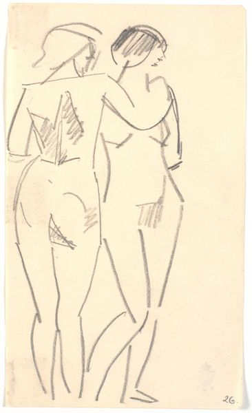 Karl Isakson created this sketch of two standing models with pencil on paper. The symbol of the embrace is one of the most enduring motifs in art, a testament to human connection, longing, and empathy. Here, the figures stand closely together, their bodies a simple contour, one arm slung over the shoulder of the other. This gesture echoes countless depictions of affection throughout art history. From ancient Egyptian funerary art, where embraces symbolized eternal connection, to Klimt's gilded lovers, we see the embrace as a signifier of deep emotional bonds. Yet, the embrace is not always tender; consider the tortured embrace of Dante and Virgil in the Inferno, representing guidance through suffering. In Isakson's sketch, the embrace hints at an underlying psychological depth. Is it comfort, support, or something more complex? Like a recurring dream, the embrace resurfaces across time and cultures, each time colored by new experiences. What we see here is not merely an act but a powerful and cyclical expression of human feeling.