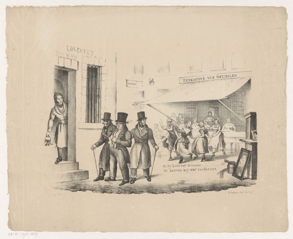 Curator: This is "Two Men Preparing for a Duel" by Nicolas Toussaint Charlet, created around 1836. It's currently housed in the Rijksmuseum. What are your first impressions? Editor: It's grimly humorous. I am immediately drawn to the body language—the forced civility amid palpable tension. But tell me more about the technique. Is this printmaking? Curator: Yes, it is an engraving, a medium allowing for precise lines that are ideal for caricature, of which Charlet was fond. We can see how printmaking democratizes access to this narrative artwork. What materials and processes catch your eye? Editor: The use of hatching and cross-hatching to create shadow is quite striking; observe, for instance, how the woman appears almost spectral in the building's entryway to emphasize her plight, this common symbol of women's disenfranchisement is also indicative of impending doom. Note, also, the visual emphasis on conflict itself, reflecting a society wrestling with class and political instability, with social upheaval. What about its cultural impact, and the social commentary in general? Curator: Definitely. This ties into Charlet's broader artistic circle and his participation in a culture critical of class disparity in early 19th century France. Also worth considering: the access printmaking granted a growing bourgeois class as patrons, a market influencing content and themes within art, no doubt. Editor: That’s interesting because I immediately think of the figure brandishing the pistol, a universal representation of authority or oppression and in a broader sense, the social constructs being challenged. In other words, do you agree, it's an image about the human condition beyond its material existence? Curator: Agreed! And the material conditions facilitated such profound questions in the artwork itself, now preserved at the Rijksmuseum. Editor: Precisely, these symbols continue echoing through time. The piece compels us to reflect upon our own engagement within systems and societal rituals of violence. Curator: I would conclude that considering the methods of production together with iconic elements offers us richer insights and better interpretation of such pieces of art, such as this one. Editor: A wonderful intersection where method and symbol meet, illuminating the past in ways both unsettling and enlightening!