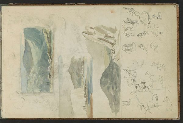 Curator: Eugène Cicéri’s "Design for a Stage Set," dating from somewhere between 1830 and 1890, presents a fantastical interior. It's rendered primarily in watercolor. Editor: It strikes me as rather eerie, even ghostly. The cool tones and cavernous architecture suggest something vast and uninhabitable, almost like the set for a gothic drama. Curator: Indeed. Cicéri excelled at imbuing stage designs with specific moods. The deliberate use of watercolor allows for a fluidity and layering, creating depth and texture within a limited palette. Note how the washes create a sense of decay and age. Editor: That "decay and age" also speak to the materiality, don’t they? This isn't about illusion alone; the transparency of the watercolor emphasizes its own properties as a substance. You can almost feel the paper beneath, reminding us that this fantasy begins with mundane materials. What sort of labor would be involved in creating and transporting sets such as this, I wonder? Curator: That’s an interesting question. Though Cicéri was well known, Romanticism often idealizes the "artist genius", and occludes the team and infrastructure behind productions like this. Thinking about materials and labour reveals how Romanticism's concern with history and drama could also depend on new industrialized approaches to design. Editor: The structure and architecture also evoke social relations for me, in this case via consumption of Romantic dramas on stage, and therefore contributing to wider understandings of how materiality intertwines with societal and class structures. And that eerie sensation I felt initially? I suspect it arises from understanding this interplay between spectacle and the work required to bring it into being. Curator: It reframes how we look at not just Romantic art, but the social foundations that allow such dramatic visions to emerge. Thank you. Editor: Thank you. Considering it materially offers a potent reinterpretation.