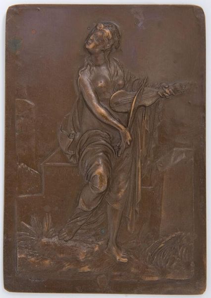 Curator: Here we have an intriguing piece, "Ariovistus, from the series 'The Twelve Oldest German Kings'," by an anonymous artist, a small bronze relief. Editor: It has a solemn, almost stoic mood. The textures—the armor, the rough ground—suggest a somber narrative. Curator: Indeed. Note how the light plays across the figure, emphasizing the lines of the armor and the resolute stance, almost a figure of defiance. Editor: And the materiality is fascinating. Bronze, with its historical associations, lends a weight and permanence to the subject. Imagine the labor involved in its production. Curator: Yes, the artistic choices elevate Ariovistus beyond mere representation, crafting a powerful image of leadership. It certainly gives the impression of command and strength. Editor: The deliberate use of bronze transforms the piece from a simple portrait into a study of historical power dynamics and the means by which such power is constructed and disseminated. Curator: A potent reminder that even in miniature, a work of art can be dense with historical and aesthetic considerations.