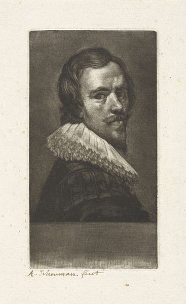 Curator: I’m immediately struck by the man’s gaze; there’s such lively directness captured in his eyes. Editor: Indeed. What we have here is Frans Hals’ “Portrait of a Man” from 1638. It's an oil painting, currently residing at the Städel in Frankfurt. The piece presents us with a solid example of Dutch Golden Age portraiture, yet feels so individual and expressive. Curator: The loose brushwork! Hals' distinctive application of paint to create this sense of movement is phenomenal. The construction of that millstone collar around his neck looks barely contained. It gives the portrait such energy. I wonder about the role that garment-making had in influencing Dutch fashion at this time. It speaks to a period of considerable trade, importing different fabric and influencing different modes of dress, doesn’t it? Editor: Absolutely. The clothing also clues us into the sitter’s social standing. Note, for example, the quality of the fabrics suggested and how they’re deployed here as visual symbols of wealth. This period witnessed the rise of a wealthy merchant class, eager to commission portraits. Hals was the go-to artist for capturing their likeness. Curator: So, the portrait isn't merely a likeness, but a constructed image meant to communicate status. Looking at the composition now, I find that framing devices play an important role here; and yet they serve a primarily decorative purpose. Did these help secure and frame his art as ‘prestige’ material? Editor: To an extent, yes. There was intense competition among artists. Consider how Hals adapted to the market by creating quickly and capturing a sitter’s essence. But more than a static image, he seems to capture personality. He injects his own interpretation and vision in portraying his subject. His fluid brushwork helped define the Baroque portrait tradition, where immediacy became desirable. Curator: A tension emerges then, between the labour that it took to acquire status, versus the rapid method that Hals deployed in production. Editor: Yes, and I'm still struck by the force of his gaze, which defies formality. It is a powerful and compelling reminder of both art and society. Curator: And for me, it emphasizes how social and economic transformations are intimately interwoven into the very materiality of art.