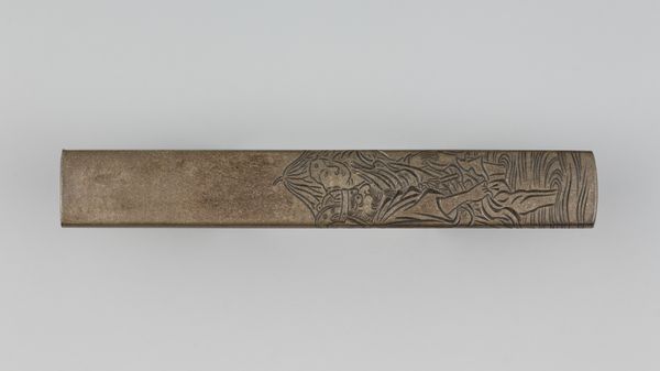 Editor: Here we have a "Knife Handle (Kozuka)," crafted sometime between 1600 and 1675 by Gotō Kenjō. It's an intricate piece, primarily made of gold and other metals using carving and relief techniques. The composition is very deliberate and balanced. What cultural meanings might be embedded within the motifs? Curator: That's an insightful observation about the composition. Notice how the artist utilizes symbols representing status and power. What reads like a ‘collection’ of objects can be further dissected into its representative power. The war fan, for instance, acted as both defensive implement and instrument for communication. The hat is similarly indicative of its period and class, not merely as a form, but as a signifier of Japanese hierarchy. What emotions are evoked when viewing the careful placement of these articles of war? Editor: That’s fascinating! I didn't realize how directly these objects could speak to status and power. There’s a feeling of reverence here; these objects, although small, feel monumentally important. So the image as a whole conveys an iconographical meaning of status? Curator: Precisely! The objects tell a narrative, creating a sense of permanence that translates across time. Note how these shapes are stylized, reduced into more suggestive than literal portrayals. What would you guess is the emotional significance of ‘miniaturizing’ these large-scale cultural elements? Editor: I suppose making something large, small might show skill, and perhaps contain or tame the raw power of these military associations. I appreciate that looking closer reveals layers of symbolic significance that might have been missed at first glance. Curator: And by understanding the visual language, we are invited into the cultural memory that is unique to Japanese society during the Edo Period. What we see isn’t just a decoration; it's a reflection of a complex social structure through careful symbolism. Editor: This has changed how I view decorative arts; it’s no longer just pretty or skillfully made, but a historical and symbolic artifact. Thank you.
