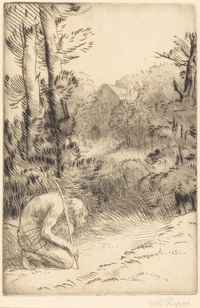 Curator: So, here we have "Little Wandering Jew," or "Le petit juif errant" by Alphonse Legros. It's an etching, that wonderful process where lines are bitten into a metal plate with acid, and then the plate is inked and printed. What do you think of this one? Editor: Immediately, I feel a kind of wistful weariness. The hunched figure, the overgrown path...it speaks to a journey, both literal and perhaps metaphorical. I wonder, how does the title play into that for you? Curator: That's a big question! "Wandering Jew" refers to a mythical figure condemned to wander the earth eternally. But here, as "little," maybe Legros is questioning grandiose narratives. Making it personal, relatable? Editor: I can see that. The figure isn't overtly religious, the landscape not overtly hostile. The politics aren’t centered, which invites more curiosity toward the imagery itself, a story contained in this tiny print. Curator: Exactly! Think about the printmaking process itself. Each line meticulously etched, each impression a repetition of this story. Mass production made affordable art available to public audiences during social unrest, making people look a bit more carefully and empathetically toward imagery and narratives about people in need, for example, "the poor." Editor: And that scale! It demands intimacy. You have to lean in, examine the texture created by the etching. Each line becomes significant in creating the shadowy landscape, making the message so small. Curator: The way Legros renders that figure, burdened but determined, evokes a quiet dignity. You feel his fatigue, his perseverance. Even without knowing the whole "Wandering Jew" story, there's a universal resonance. A testament to the artist's ability to evoke a powerful emotion with very few lines. Editor: Yes, Legros managed to suggest the hugeness of nature with such an economic, simplified visual approach. In today's climate, this art offers a small but impactful reflection to see through. It helps us think about where and how these figures find themselve and whether and where to offer solace. Curator: And isn't that what great art does? Offer solace, provoke questions, make us a little more aware of the world, and perhaps even to ourselves? Editor: Absolutely, even in the smallest of packages, even in etched lines made generations ago. Curator: That resonates! I feel the desire to pause now to let the listener explore that inner landscape in Legros’ vision.