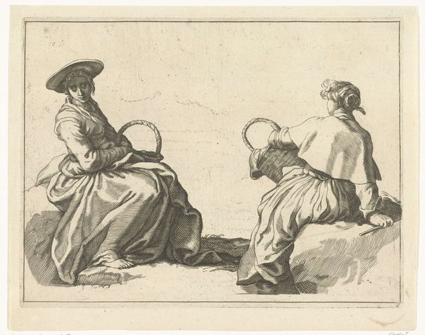 Editor: So, here we have "Vrouw en man met eieren," or "Woman and man with eggs," by Frederick Bloemaert, dating from after 1635. It's currently housed at the Rijksmuseum. As an etching, it has a delicacy to it that's really striking, a kind of intimate feel despite depicting everyday figures. What catches your eye in this scene? Curator: The figures' postures. Note how the woman sits beneath the tree, almost integrated with its roots. It's a symbol of rootedness, of belonging to the land. The man, leaning on the basket, seems more transient, a peddler perhaps. Eggs, themselves, are potent symbols: potential, birth, fragility. The basket becomes a vessel of hopes and dreams, quite literally carried on his shoulders. Editor: So the eggs are more than just breakfast, then? Curator: Oh, absolutely. In Dutch Golden Age painting, even seemingly simple genre scenes are often layered with symbolism. Consider, too, the gaze of the figures. She looks inward, contemplative. He seems to be looking towards us as the implied receiver. It could speak to broader ideas about the cycles of life, about our connection to the natural world. It's a contrast, wouldn’t you say? He is focused on labour, commerce perhaps, whilst she reflects. Editor: It's funny, I just saw two people with some eggs, and now I’m seeing so much more. I'll have to pay more attention to gestures! Curator: Indeed! Looking for the symbols woven into everyday imagery provides endless fascinating layers, once you know to see it. Editor: I guess what's mundane for some can become powerfully meaningful for others, depending on your perspective and culture! Thanks.