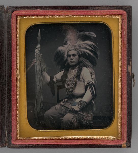 Editor: Here we have "Untitled (Indian Chief Maungwudaus, Upper Canada)," an albumen print dating back to 1855 by Donald McDonnell. The portrait's dark tonality gives it a solemn, almost severe, character. How would you begin to unpack the visual language present in this photograph? Curator: I’m drawn to the geometric interplay at work here. The oval frame contains the sitter’s form, further emphasized by the cascading lines of the feathered headdress which both frames his face and directs our gaze. The deliberate arrangement of light and shadow creates a visually arresting composition, emphasizing the contrast between the textured feathers and the smooth planes of his face. Do you notice how the framing cuts the figure just below the shoulders? Editor: Yes, cropping the figure this way makes the image more intimate. How does the materiality of the photograph itself – the albumen print – influence your reading? Curator: The albumen print provides incredible detail, especially in rendering the intricate textures of the headdress and clothing. This almost tactile quality is critical. But there's an interesting paradox at play. The technology promises objective representation, yet the staged setting, costuming, and formal pose inherently perform an act of visual construction and idealization. The sheen adds another layer, blurring the image with ambient reflection in certain areas, thus flattening what should be perceived as depth, Editor: So, the surface detail and framing become ways to read this work. That's really helpful. Curator: Precisely. Considering these aspects helps to grasp the structural intentions behind the work, rather than relying on extrinsic information to determine its worth. We've also touched on the object of the piece and where and how light has been applied. This all gives us a good sense of what to perceive and how the different elements work together.