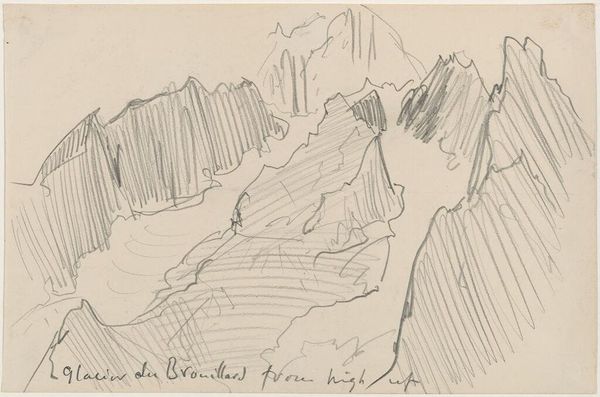 Editor: This is Marsden Hartley's "Alpspitze," a drawing done in 1933. I’m struck by the use of line to create such a powerful sense of depth and form, despite the limited color palette. What aspects of its composition stand out to you? Curator: The linear network establishes a visual scaffolding that articulates the mountain's craggy facade. Note the strategic deployment of hatching and cross-hatching. How do these techniques contribute to the overall structural integrity of the work? Editor: It's almost like he's mapping the mountain through texture. The varying densities definitely create a sense of light and shadow. Curator: Precisely. The reduction to line and tone brings focus to the underlying architecture. We see Hartley grappling with form stripped bare. Editor: I never thought about the lines being structural until now, thank you! Curator: An astute observation. It is through such focused attention that we begin to truly decipher the artist’s intent.