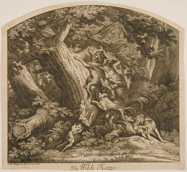 Editor: Here we have Johann Elias Ridinger's "Lynx," an etching. I'm struck by the tension in the scene. It feels very immediate, almost like a snapshot. What can you tell me about it? Curator: Look closely at the lines, the crosshatching. It speaks to the labor involved. This wasn't a quick sketch; it was a crafted object made for consumption. How does the print medium affect your understanding of the depicted hunt? Editor: I hadn't considered that. The act of reproduction changes the work's meaning. So, it's not just about the hunt itself, but also the distribution of that image? Curator: Precisely. And who consumes such imagery? Think about the social context. It's not just about appreciating nature, but about asserting power and control through representation. Editor: That adds a new layer to it. I see it’s not just a scene; it's a statement about society and the means of making art. Thanks!