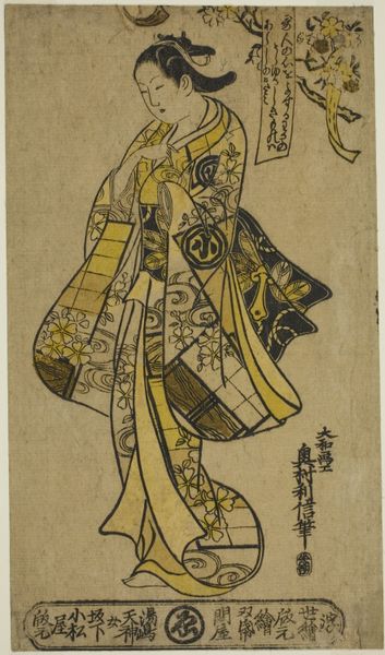 Curator: Right now we're looking at *Matsukaze, from "Album of Courtesans (Keisei ehon)"*, a woodblock print made with ink on paper by Torii Kiyonobu I around 1700. It's part of the collection here at the Art Institute of Chicago. Editor: Immediately, I'm struck by the quiet grace of it. It’s all curves and soft edges despite being a stark black-and-white print. She looks like she's about to float right off the paper! Curator: Indeed! Kiyonobu was a master of the *ukiyo-e* style, and this print really shows off his skills. The use of woodblock printing, especially the key-block method typical of the era, meant that the process was highly collaborative. We often overlook the crucial role of the artisans who transferred the artist's vision onto the block and then carefully printed it. Editor: Thinking about that physical process of creation...I can almost feel the artisan carefully carving away at the wood. It really makes me appreciate the time and labor invested. Curator: Exactly! And *ukiyo-e*, meaning "pictures of the floating world," originally depicted the pleasure quarters and celebrated urban life. This print would have been relatively affordable and widely distributed, showcasing not only the beauty standards of the time, but also fueling a whole economy of consumption. Editor: Consumption…it’s interesting to think of art that was so integrated into the daily lives of ordinary people. She feels very alive, very present... Do you think she knows how many eyes have met her gaze over the centuries? Does the original creator know her work is here with us? Curator: Those are beautiful questions! Analyzing the art and the methods and historical setting does connect us through shared humanity, however separated we might be by time and space. Editor: In a way, the artist and artisan become immortal through their works. Curator: Exactly! So, here we have it, art connecting artisan and the creative mind to modern eyes and souls. A good example to sum it all up!