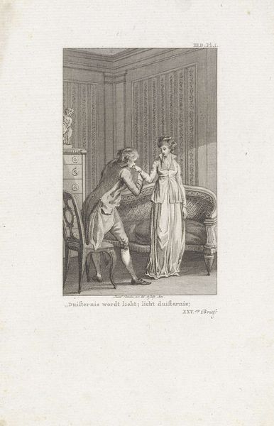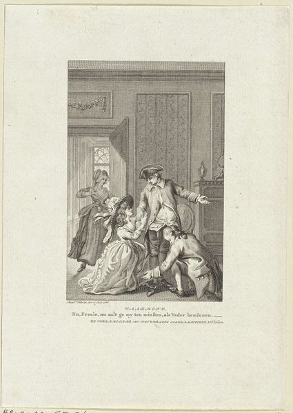 This print, "Young Woman Comforts Her Crying Friend" was made by Reinier Vinkeles. We don't have an exact date, but Vinkeles was active in the late 18th century, and the work likely dates to that period. Prints like these were often made using a technique called engraving, where lines are cut directly into a metal plate, which is then inked and pressed onto paper. The quality of the line here is very fine and precise, which gives the image a sense of elegance and refinement. Engraving in this period was a skilled trade, sitting in the middle ground between craft and art. Vinkeles would have served an apprenticeship, learning to control the burin, the tool used to carve the lines. This kind of work, while creative, was also deeply connected to the world of commerce and illustration. Prints like these were part of a wider culture of reproduction, making images accessible to a broad public. So, when we look at this image, we're not just seeing a scene of friendship, but also a record of skilled labor, and a glimpse into the world of printmaking.