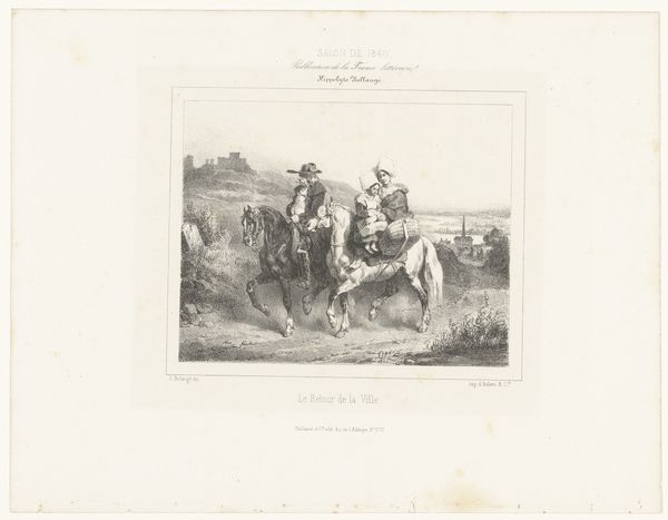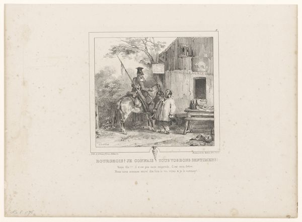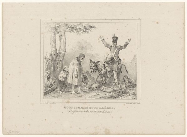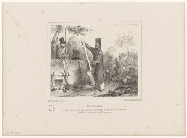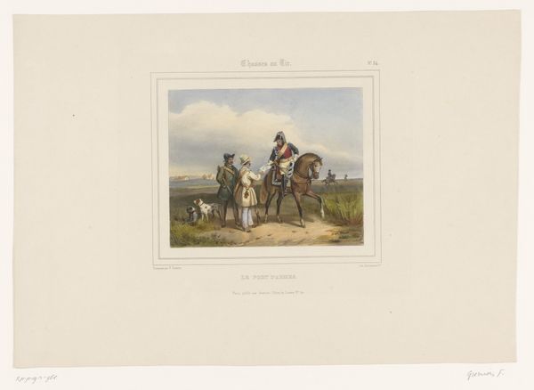 Curator: Before us is "Hunter Showing Another Hunter His Shot Hare" by François Grenier, created between 1831 and 1846. It is an engraving. What's your initial take? Editor: There’s something melancholic about it. It's not just a celebration of the hunt, it feels quite… somber, doesn’t it? It feels small scale. It's interesting how flat the landscape appears to be. It is a print and feels like a moment, not a place. Curator: I think that observation speaks to the complexities of Romanticism. This isn't about celebrating nature in an idealized way, but also reflecting on our place within it, and perhaps even questioning our dominion over the natural world, even critiquing labor itself, as seen with hunting. Think about who had the right and privilege to engage in hunting at that time. The hierarchy in their clothing says everything. Editor: Absolutely. Looking at the technique, it's interesting how the engraving allows for this incredible detail, almost like a snapshot, freezing the moment in time, to document that social order. Also consider that process. This piece can be reproduced almost limitlessly, and distributed almost everywhere, becoming an instrument to solidify or potentially critique dominant ideologies. Curator: It's not merely about the hunt, it's about the assertion of control, specifically within patriarchal structures, reflected in the hunters and even perhaps in the dejected demeanor of the child and dog in the scene, suggesting perhaps the cycle of socialization and exploitation that happens through hunting as well as how the landscape itself plays a part. Think about what laboring this land would entail. Editor: The landscape is definitely the linchpin for all these social and labor components. Its almost a kind of raw material in which they're all able to perform their functions in that context of 19th century hunting, and it reflects those functions by being very much just there, it is what they do things *in*. Curator: Right, and it's through this lens that the materiality of the print also gains meaning. This is not a painting, with claims of genius and creative ability; but the choice of a reproductive technology expands conversations around genre-painting, the production of art, and its purpose in wider society. Editor: That's an interesting point about artistic status too. By showing the landscape and showing the materials of hunting like this the artwork almost challenges traditional fine art conventions that would ignore a 'banal' moment like this for something considered a grander scene or moral lesson. Curator: It pushes the boundaries of our understanding, revealing art can reveal social systems. Editor: And reflect on its place in shaping it!