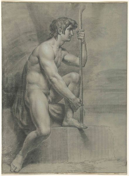 This drawing of a seated male nude with a staff was made by Daniël Dupré. The figure's staff is not merely a support; it is a scepter of authority and guidance, echoing the staffs of shepherds, pilgrims, and patriarchs throughout art history. Consider the ancient Greek kouroi, often depicted nude, symbolizing ideal beauty and strength, and their association with the pastoral ideal. The staff reappears in classical depictions of Hermes or Mercury, guiding souls and embodying transition. The image's psychological power rests in its evocation of these archetypes. It stirs something deep within us, a collective memory of human potential and our connection to nature. These symbols are not static; they evolve. In medieval art, the shepherd's staff becomes a symbol of Christian leadership. The staff's journey is circular, its meaning oscillating across time and cultures, each era reinterpreting its significance, adding layers to its rich tapestry.