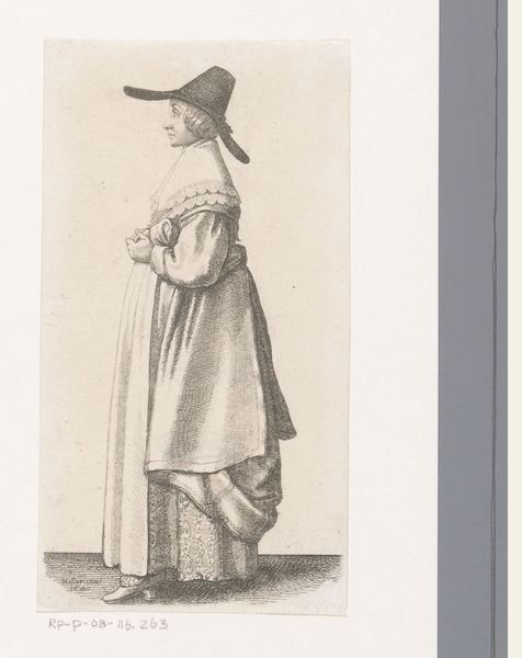 Curator: Immediately, there's a starkness. The linework is quite economical, but it gives such volume to the figure. Editor: Precisely! Ernst Willem Jan Bagelaar created this ink drawing on paper, "Standing Farmer Woman," sometime between 1785 and 1837. It embodies a particular fascination with representing everyday rural life. The narrative emerges primarily through a focus on the woman herself. Curator: Agreed, it's the directness of the depiction that strikes me. Look how the washes define her form, creating a sense of depth and weight. The minimal shading around her feet grounds her so effectively, doesn’t it? Editor: It certainly gives her a presence. These so-called genre scenes became incredibly popular. What is she thinking, feeling, her experience as a member of a hard working class? Artists found an eager audience among a bourgeoisie that was increasingly sentimental and enjoyed these picturesque rural depictions, particularly farmers. This also romanticized her position in a way. Curator: An intriguing point. Yet, on close inspection, the drawing has so much compositional rhythm, achieved so economically by varying the weight of the line and the areas of shading. There is this dance in how the robe falls from the right and her head gear on the left and how those echo downward into the contour of the calf. Editor: Absolutely, it's like Bagelaar is dissecting this figure into its essentials. There is something unidealized and dignified here at the same time. By foregoing flourishes in her attire and not flattering, the drawing really captures some type of experience, real or constructed. It raises interesting questions. Curator: A beautiful reminder that even a simple sketch can hold multiple layers of meaning and invite various viewpoints, be them social, historical, or purely aesthetic. Editor: Indeed. It urges us to remember the complexities inherent in even seemingly simple representations and reminds us of the power dynamics at play during that time in the Dutch Republic.