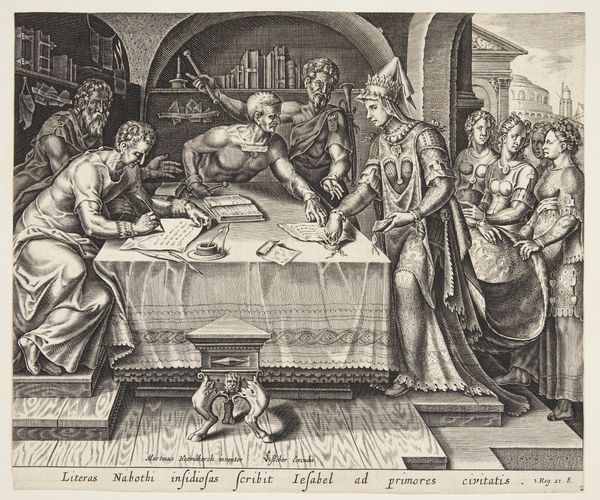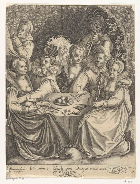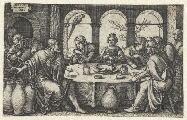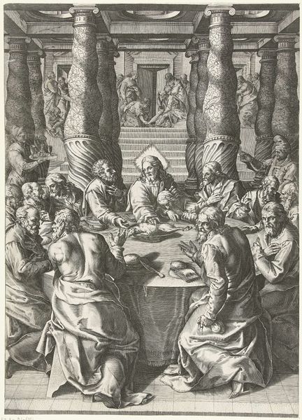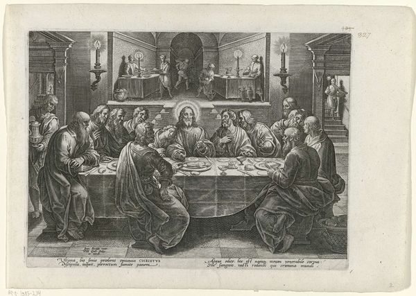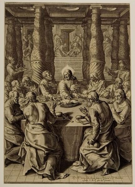 Editor: This is an engraving entitled 'The Last Supper,' made by an anonymous artist sometime between 1570 and 1600. The textures created by the engraving are striking, creating intense light and dark contrasts. What catches your eye in terms of the visual structure of this piece? Curator: Note the artist's engagement with Mannerist conventions. The composition eschews classical balance, favoring dynamic asymmetry. The figures are tightly packed, their gestures and expressions exaggerated, resulting in a palpable sense of emotional unrest. Notice, also, how the dramatic use of chiaroscuro further heightens the emotional intensity. Where do you see evidence of Mannerist techniques at play? Editor: The elongated bodies, the almost theatrical poses – they definitely depart from earlier Renaissance ideals of harmony and proportion. And there’s so much activity, it’s quite different from, say, Leonardo’s serene version. Curator: Precisely. Leonardo achieved equilibrium. Here, the surface vibrates. Light doesn’t model form naturally; instead, it creates highlights and shadows that emphasize the artifice. Consider how the composition uses horizontals and verticals to convey emotion. Editor: I see what you mean. The lines formed by the table and the figures behind it create a stage-like space, heightening the drama. This analysis is so interesting and changes my view on the subject matter to notice those lines. Curator: Examining the artwork's visual devices underscores how the artist manipulates form to convey complex emotion and meaning, transcending a simple depiction of the scene. A strong formal execution reveals the complexities of interpretation. Editor: Thanks! Paying closer attention to formal composition provides a new framework to understand visual art.
