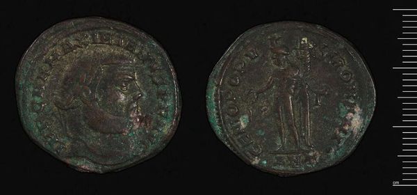 Curator: This is a Follis of Maximian I, minted in Rome. The piece weighs 8.93 grams and depicts Emperor Maximian I Herculius. Editor: It's remarkable how the patinated surface lends such a somber and weighty feel to the imagery. The very texture communicates the age and the authority it once held. Curator: The Follis offers a window into the socio-political landscape of the Roman Empire, functioning as currency and propaganda. Its imagery would have reinforced the emperor's power and legitimacy. Editor: Indeed. And yet the composition—the incised profile, the surrounding text, the figure on the reverse—it all works to create a harmonious and powerful symbolic whole. Curator: The coin also reflects the economic and political strategies employed by Maximian to consolidate his rule, revealing the power structures of his reign. Editor: It is compelling how the material qualities of the Follis, along with the formal arrangement of its design elements, still manage to speak to us across the ages.