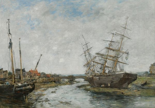 Curator: This is Eugène Boudin's "Camaret, the Port," painted in 1872. Boudin, a forerunner of Impressionism, captures a bustling harbor scene in this oil painting, currently held in a private collection. Editor: Well, my first impression is definitely melancholic. The muted grays and blues, the somewhat desolate feel... it’s like a scene from a sailor’s ballad about leaving port and loved ones behind. Very evocative. Curator: Absolutely. Boudin’s work here provides insight into maritime communities and labor in 19th-century France, when industrialization and colonial endeavors deeply influenced port cities like Camaret. The activities of shipbuilding and seafaring, often romanticized, were underpinned by the back-breaking work of ordinary people, a reality Boudin subtly acknowledges. Editor: You can almost smell the salt and tar, can’t you? And I love how the light dances on the water. The brushstrokes are loose, almost blurry, giving everything a dreamlike quality. I find that he renders the sky with a sublime delicacy – almost a character of its own. The people, they're so small, nearly consumed by this scene that is both picturesque and monumental in terms of industrial narratives. Curator: His rendering of the sky is indeed notable. Boudin’s focus on painting en plein air, directly observing the atmospheric conditions, distinguishes his contribution from his contemporaries. There’s a palpable sense of realism – the chill in the air, the dampness on the docks, the fleeting moment of sunlight piercing through the clouds – this is how one can see his subtle critique to romantic depictions. He presents working class lives, without embellishment but also without disdain. Editor: It really makes you think about the relationship between humans and nature, and about human labor as an industry that exploits natural resources, while celebrating that. It’s a beautiful, thought-provoking painting. Like looking into a misty mirror reflecting the past. I’m especially drawn to that single figure in the center, the individual standing alone, facing the viewer but so obviously involved in the busy, almost frantic scenes all around them. They offer us the viewer access to a different perspective, perhaps? Curator: Considering gender, race, and class, such access enables complex intersections. A scene reflecting its era of transformation where the collective toil overshadows individuality, while hinting at both human costs and technological progress – truly a rich narrative encapsulated in paint. Editor: It’s made me appreciate the complexity beneath its initially somber façade. Curator: Precisely, it's in those layers where the depth lies, don’t you think?