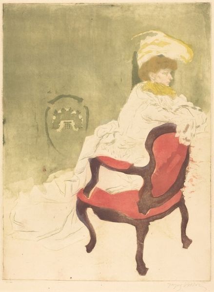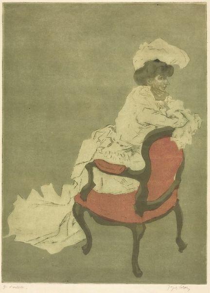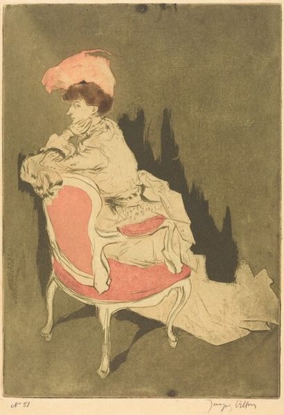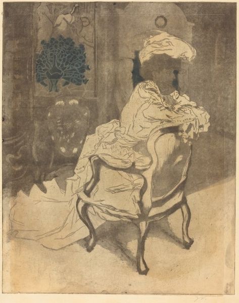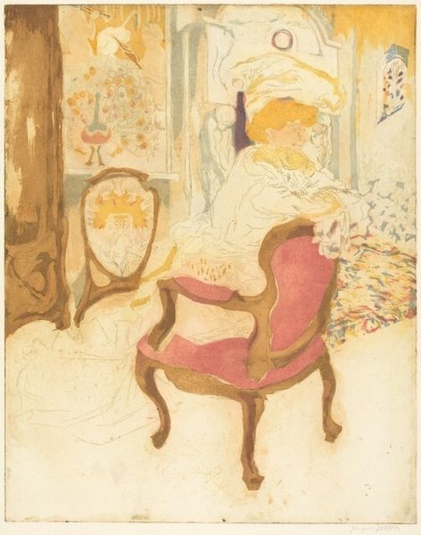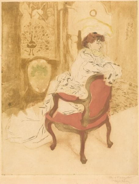 Curator: Immediately, I feel a sense of quiet contemplation radiating from this piece. The subdued colors and the woman’s posture evoke a mood of introspection. Editor: Here we have Jacques Villon's "La Parisienne (10)," created around 1902. Villon was part of a milieu deeply invested in representing modern urban life through printmaking. This etching is a superb example. Curator: The interior setting— the patterned wallpaper and that curious blank clock face—they contribute to the symbolism. The woman's placement, almost pressed against the chair, speaks to internal constriction. It's quite subtle. Editor: This work showcases the rise of "La Parisienne" as a cultural icon, simultaneously empowered and objectified in a rapidly changing social landscape. Notice how the print medium itself facilitated wider access and engagement with these images. It became part of the Parisian environment in posters and prints. Curator: Indeed. Peacock designs and the chair – deep crimson which hints towards more worldly associations than pure feminine innocence. Is that truly decorative, or suggesting an awareness of her place in the world? Editor: Absolutely. Peacock motifs gained popularity in art during the Belle Époque. Peacocks were perceived to be symbols of beauty and status, frequently incorporated into the décor of Parisian apartments. The etching showcases a growing fascination with how women navigated their newfound roles. Curator: What I find truly compelling is how Villon, through this seemingly simple domestic scene, captures the conflicting emotions that arose as social structures began shifting around Parisian women. Editor: Villon really uses this print as a window into Parisian society and women's fashion; both deeply influenced by cultural changes as women took over different spaces. Curator: A lasting impression. Even now, over a century later, we recognize in this print the echo of a world undergoing massive transition, particularly for women. Editor: I agree completely. Seeing her in this environment offers not only the aesthetics of that time but also allows us to explore these silent questions around visibility, identity, and even expectation.