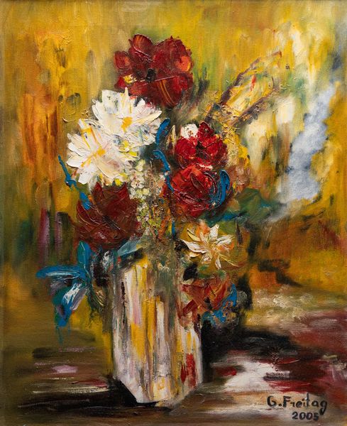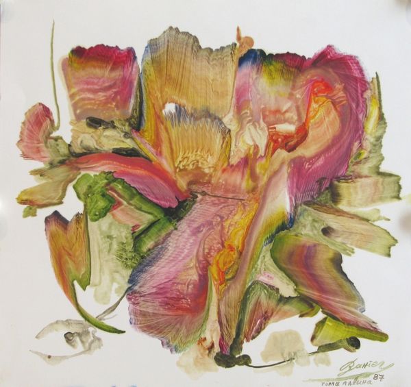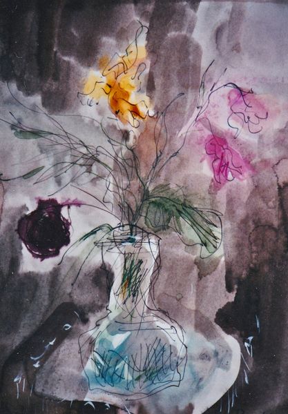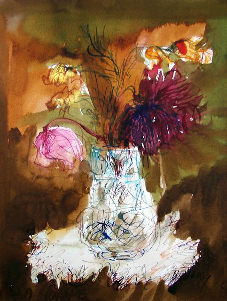 Maria Bozoky made this small watercolor painting, Roses, on paper sometime in the 20th century. Her quick, transparent brushstrokes capture the light on the blooms in a way that feels both immediate and timeless. I'm drawn to how Bozoky lets the watercolor do its thing. See how the colors bleed and blend, creating soft edges and luminous shadows? It's like she's not trying to control the paint too much, but rather allowing it to express its own inherent qualities. Notice especially the confident strokes which form the body of the vase, and how they pool at the base, as if the vase were somehow melting into the table. This piece reminds me a bit of the earlier flower paintings by Emil Nolde, another artist who wasn't afraid to let the watercolor flow, and who understood that a painting is a conversation between the artist and the medium, a dance of intention and accident.