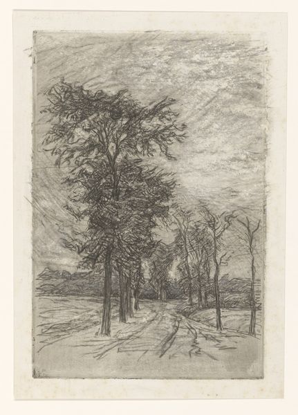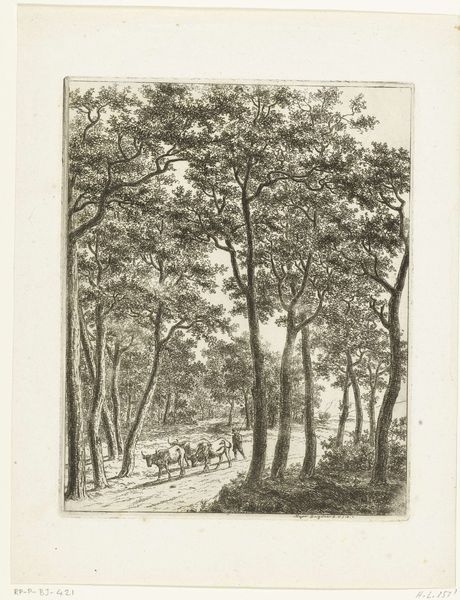 Curator: This etching, dating roughly from 1798 to 1837, is titled "Two Men with Dogs in the Forest," crafted by Ernst Willem Jan Bagelaar using pen. What's your immediate response to this piece? Editor: A sense of quietude strikes me first. The density of the forest rendered with delicate lines gives it a somewhat dreamy quality. Almost as if a fleeting moment of solitude, away from the more structured aspects of society. Curator: Absolutely. This period sees a rise in Romanticism, with a renewed focus on nature and individual experience. We observe the emergence of public parks during the early 19th century— spaces for leisure and reflection but also expressions of social status. To depict individuals casually in a forest would speak to larger changes in land use and ideas of freedom during that period. Editor: And the dogs further that image of freedom, of connection with the primal. The forest itself is a potent symbol – of the unknown, the untamed, the unconscious. What kind of person goes into the forest in that historical context? I see a hint of wanderlust in the etching. Curator: Considering Bagelaar was an artist during a period of immense socio-political change—from the Batavian Republic to the Kingdom of the Netherlands—it makes sense that his art reflected the fluctuating roles of the individual versus society, of the importance of nature. Did the emerging middle classes have newfound freedom and the possibility of independent contemplation in spaces beyond aristocratic gardens? Editor: It makes me think of a quest for authentic experiences, even if fleeting, for those whose lives were increasingly dictated by urban spaces. Note how they are moving towards the horizon, guided by the unknown depths of the woods. It does suggest an attraction, as much as any feeling of being lost. Curator: The density and the technique create such a compelling dichotomy, yes. Its creation parallels those dichotomies as well, I imagine, from raw materials to the market, a process mediated by economic structures to allow us to consume this piece today. Editor: It is really rewarding to reflect upon such intricate imagery like this. Thank you for pointing out the historical framework that lends to its symbolism. Curator: Likewise, reflecting on symbols makes us both consider the artwork on view, and our current views on art.