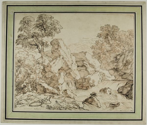 Editor: Here we have Johannes Tavenraat’s “Rocks and Vegetation,” created around 1840 using watercolor. There’s a kind of rugged, almost imposing feel to this rock formation. What do you see in it? Curator: Well, the immediate thing that strikes me is the artistic shift toward the celebration of nature that was taking place at that time. You see this a lot during the Romanticism era. What I find interesting here is the implied public consumption, the rising interest from wealthy bourgeois in picturesque nature. Editor: You mean, people started wanting landscape paintings more? Curator: Exactly. With industrialization transforming landscapes, these watercolors helped construct a visual ideology around nature – untouched, sublime, a retreat from urban life. Tavenraat and his contemporaries contributed to that ideal. It became a commodity. Do you see any traces of that commercial aspect here? Editor: Maybe in the way he’s made the rocks almost beautiful? Less about accuracy, more about feeling? Curator: Precisely! Think about where this painting might have been displayed – in a bourgeois home, signaling taste and a connection to an idealized nature, maybe sparking conversations, bolstering status. That display is just as important as the art itself. Editor: So, the image itself plays a role in wider cultural stories about nature and social class? That's really interesting to think about! Curator: It is, and understanding that link helps us see this landscape in a completely new way.