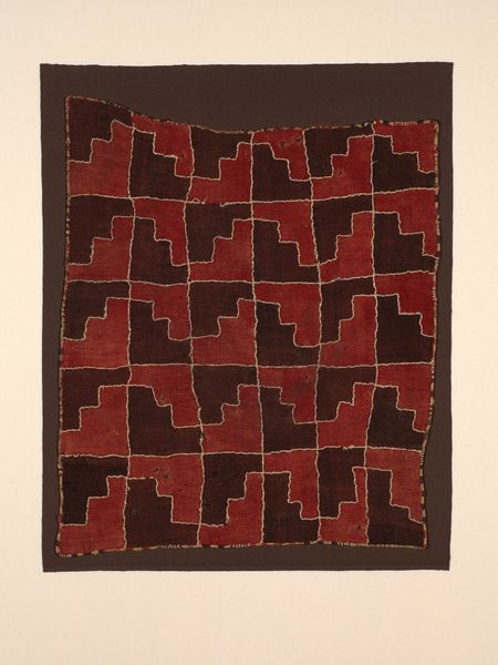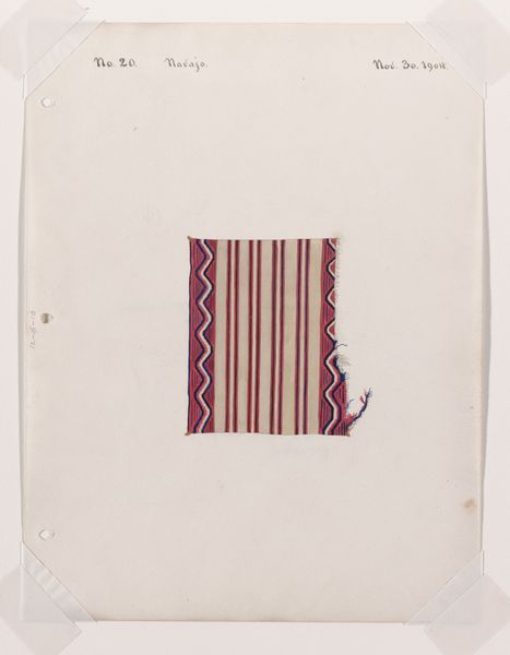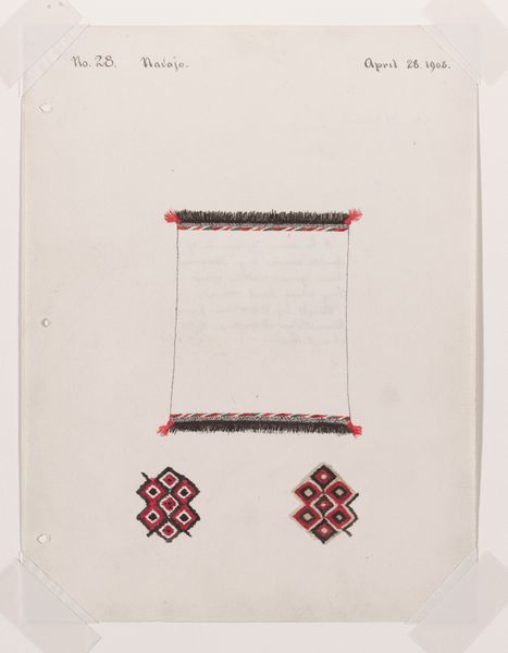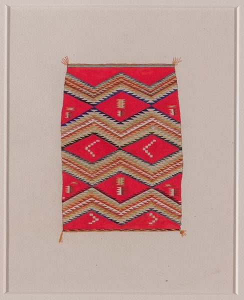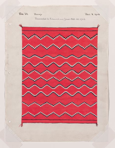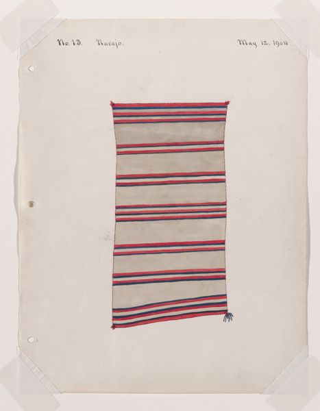 Curator: Here we have “No. 3,” a watercolor and drawing created around 1901 by an anonymous artist. It’s held here at the Minneapolis Institute of Art. Editor: I’m struck by the bold geometry—those fierce zigzags against that raw, earthy brown. It’s got a potent visual punch. It looks like an experiment in patterns and repetition. Curator: Indeed. The notation along the top edge actually reads “Navajo Squaw-dress (Bayetta).” It looks as though the artist rendered the design for a textile that would have been worn by Navajo women. We should address how its origins reflect material culture as both artifact and trade good. Editor: So, this wasn't just a pretty picture; it’s about cultural transmission and value, the economic forces shaping Indigenous art forms. Fascinating. Curator: Precisely. The term “bayetta” itself refers to a type of woven cloth, typically woolen, often dyed with vibrant colors. The trade of bayetta cloth had a considerable impact on Navajo textile production, as Indigenous weavers started to incorporate these new materials and dyes into their existing weaving techniques. It also transformed their relationship to local marketplaces and the dominant culture’s expectations for what Indigenous material production meant. Editor: It does invite contemplation on how external materials and markets reshape indigenous artistic expression, eh? Like, how does access to bayetta impact established techniques or patterns? The tension between tradition and innovation feels incredibly present here. And seeing the artist’s hand, literally the drawing materials… watercolor is very immediate. The work itself, as a document of cultural and artistic exchange. Curator: Exactly, the use of watercolors provides a sense of immediacy and vulnerability. It serves as a powerful testament to cultural exchange, adaptation, and the ongoing negotiations that inform artistic practice. Its minimalism echoes an intention for craft. Editor: Makes you wonder who this artist was, doesn't it? What stories were swirling as they translated textile into pigment on paper? To sit here and imagine is almost painful. Curator: Yes, reflecting on their lost perspective is evocative in its own way. But seeing how their act continues, inspires, resonates today feels vital, too. Editor: So true. It pushes us to actively look beyond surfaces, beyond aesthetic choices, and dive headfirst into the complicated relationships and materials that underpin it all.