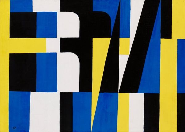Curator: John McLaughlin’s "Number 13" from 1961. It's an acrylic on board piece, and a very compelling example of Hard-edge painting. Editor: Striking. The composition, with its crisp lines and blocky fields of yellow, black, and blue is so immediate, so arresting. It commands attention. Curator: Indeed. McLaughlin developed his signature style after immersing himself in Eastern philosophy and the notion of stripping art down to its essence. "Number 13," with its precisely rendered rectangles, embodies this pursuit of pure, non-objective form. This reflects the pervasive influence of Zen philosophy and Japanese aesthetics on mid-century American art and design. Editor: The colors, too, are crucial. They're so bold and assertive. Yellow vibrates against the stark black and assertive blue. And how each block ends perfectly aligning in one top, and one bottom line across. Semiotically, these solid rectangles become powerful symbols. Is it reaching to say they represent figures or states of being? Curator: That interpretation has definitely surfaced. And while the reading of geometric shapes as symbols gained momentum with Pop Art in the decade that followed, McLaughlin wanted his work to prompt viewers toward self-reflection. To encounter the pure aesthetic without preconceived notions and achieve, through it, a kind of mental stillness. So, if you perceive 'figures,' then that might reveal more about your current disposition than anything. Editor: That resonates. Because of the cultural moment of its making. It strikes me as an antidote to the chaos and anxiety of the Cold War, a minimalist sanctuary for the eye. It's fascinating how art can act as both a mirror to society and a retreat from it. The formal, pristine elements are suggestive of how one might compose themselves when pressured to fold into something more complex than oneself. Curator: Exactly. It’s a powerful reminder of art's potential to shape not just visual culture but our individual experience within it. Editor: Precisely. I hadn’t considered this particular sociopolitical aspect when only accounting for composition, scale, and tone. Thank you.