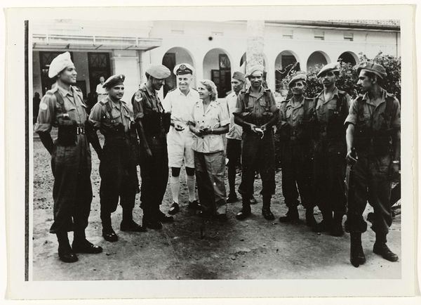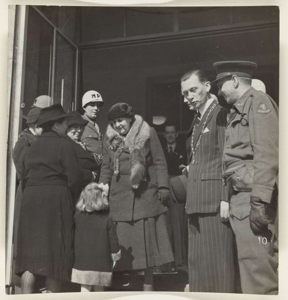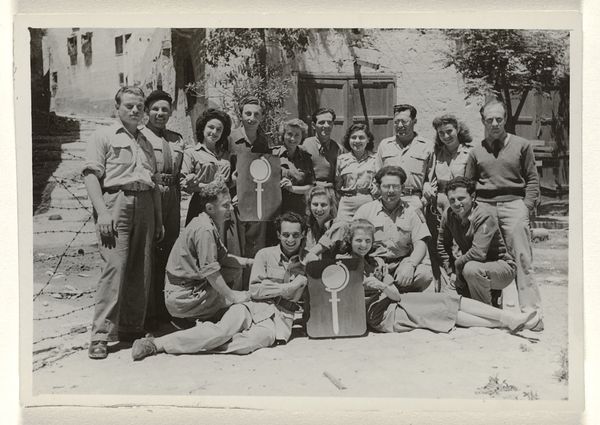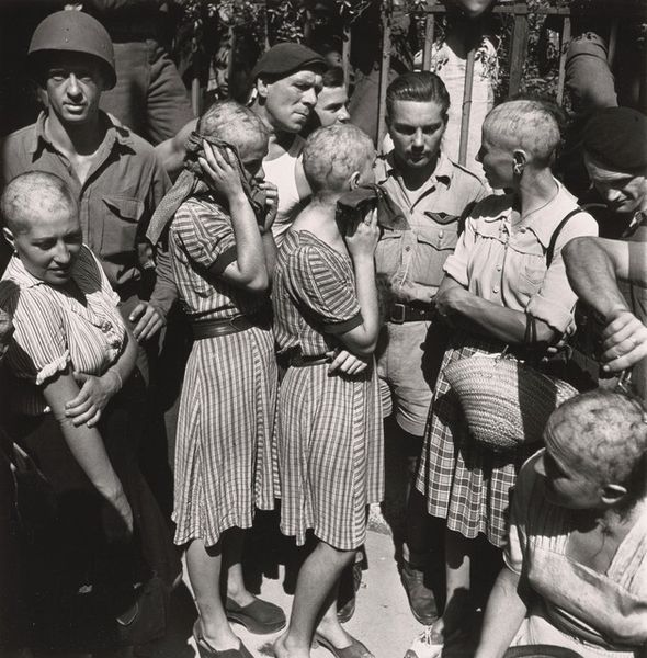 This image, made by Constance Stuart Larrabee, captures a scene in St. Tropez, France, though we don’t know exactly when. It's a photograph, so the marks are made by light and shadow rather than paint, but the composition and tonal range gives it such a heavy feel. It's all in black and white, which flattens the space, making the figures press up against each other. The texture is defined by the grain of the film, giving it a gritty, documentary feel. Look at the hands holding the woman’s head as her hair is shaved, the light reflecting off the ring worn by one of the men. It’s a small detail, but the light catches it, making it stand out, a symbol of something, though I’m not sure what. This photograph reminds me of some of the work by photographers of the Farm Security Administration in America, artists like Dorothea Lange, Walker Evans or Gordon Parks. It speaks to the power of photography as a tool for bearing witness and recording difficult histories, even those that resist any one easy meaning.