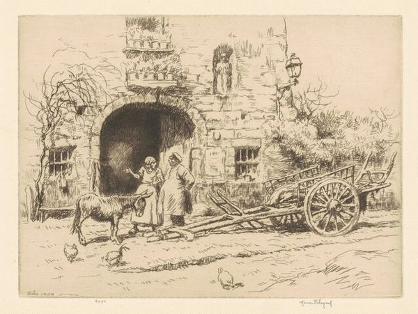 Editor: This is Plate XLI by Jacques-Francois-Joseph Swebach, and it depicts a scene with figures and a horse-drawn cart. It looks like an etching. What can you tell me about it? Curator: Well, consider the labor embedded within this image. Notice the working animals, the loaded cart, and figures engaged in what seems to be commerce. The print medium itself democratized art, making scenes like this accessible to a broader audience. How does the dilapidated building in the background play into this narrative of production and consumption? Editor: That's a great point; it makes me wonder what that building used to be, and how it connects to the scene of commerce in the foreground. Thanks! Curator: Indeed! It makes one think of the past versus the present.