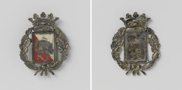 This is a small, undated silver pendant from an anonymous artist portraying Willem V and Wilhelmina of Prussia, Prince and Princess of Orange-Nassau. Its diminutive size and intricate detailing immediately draw the eye, showcasing a fascinating interplay between form and function. Consider the pendant's structure, how the central oval relief of the profiles is framed by a more elaborate, sun-like perimeter. This contrast creates a visual hierarchy, emphasizing the regal figures while simultaneously embedding them within a broader, ornamental context. The profiles themselves, rendered with a precise and delicate touch, capture the likenesses of the sitters. Note the direction of their gaze, fixed and forward, suggesting a sense of purpose and authority. The choice of silver as a medium enhances the pendant's symbolic value, reflecting the wealth and status of its owners. Yet, the artist's choice of simple composition and precious metal serves not only an aesthetic purpose but also situates the pendant within a network of cultural and historical references. The object invites us to consider how form and function are intertwined.