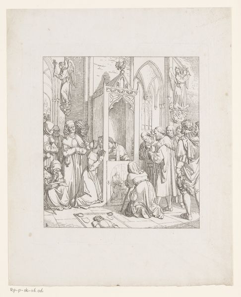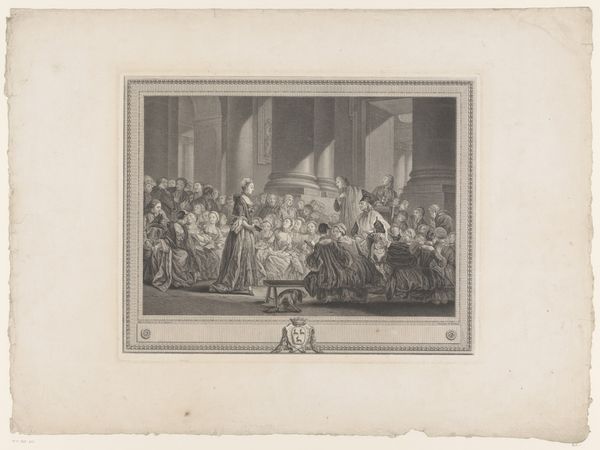 Curator: This engraving by Reinier Vinkeles, created in 1776, depicts a rather dramatic scene titled "Radbod laat zich niet dopen, 719" – Radbod refusing baptism. Editor: It certainly is dramatic. The light and shadow play emphasize a stark contrast, highlighting Radbod's defiant stance. I see the monks holding a crucifix with downcast faces and Radbod is presented almost as if he were ascending a pedestal in defiance of the clergy. Curator: Yes, Vinkeles really captured the tension of that historical moment. Radbod, the Frisian king, is said to have withdrawn from baptism upon learning he wouldn't be able to meet his ancestors in heaven because they were not Christian. This work and others were commisioned for printed historical books with an enlightened idea of tolerance. Editor: That single bare foot, poised just above the font. Water, typically symbolic of cleansing and rebirth, here represents division and resistance. What can we interpret from it? I suppose it is the end of his ancestors customs as well as his end as king. Curator: Precisely! The artwork subtly reinforces Radbod's allegiance to his forefathers' beliefs. Look how the architectural details of the interior setting serve as more than just a backdrop. It frames a certain view of the social structures that shape religious identity during the period. It brings to mind a long lasting question, is someone truly free to choose if they're only presented one possibility? Editor: I appreciate how the architectural setting in itself evokes religious dominance. What appears as Gothic revival details actually is a narrative and an intentional element with Vinkeles´ signature on it. Vinkeles´ intention goes beyond depicting an event; he encapsulates a larger dialogue. The light, the shadow, even the texture achieved through engraving, all converge to underscore the cultural weight of Radbod’s choice. Curator: Absolutely. This image and others alike served to define the cultural narrative of its time. In order to cement their views and agendas through symbolism. Editor: It leaves us pondering the ongoing power of images to capture those defining moments, where history pivots. Curator: It's a striking illustration of history not just depicted, but actively constructed.
