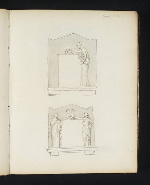 Editor: Here we have a sketch by John Flaxman, from the Tate Collections. It's a delicate pencil drawing with religious undertones. What strikes me is the repetition of figures in different poses; it looks almost like studies on one page. How would you interpret this work? Curator: Flaxman’s sketches reveal the 18th-century fascination with classical forms and the role of the artist in shaping public morality. These figures, reminiscent of reliefs, reflect a broader movement towards Neoclassicism, impacting art and political imagery. Do you see how this aesthetic connected to the era's ideals? Editor: I hadn't considered the political aspect, but it makes sense that the classical style would align with the era's values. Thanks for pointing that out. Curator: Flaxman's work shows us how artistic styles are intertwined with the social and political dialogues of their time, influencing the public's perception of virtue and order.