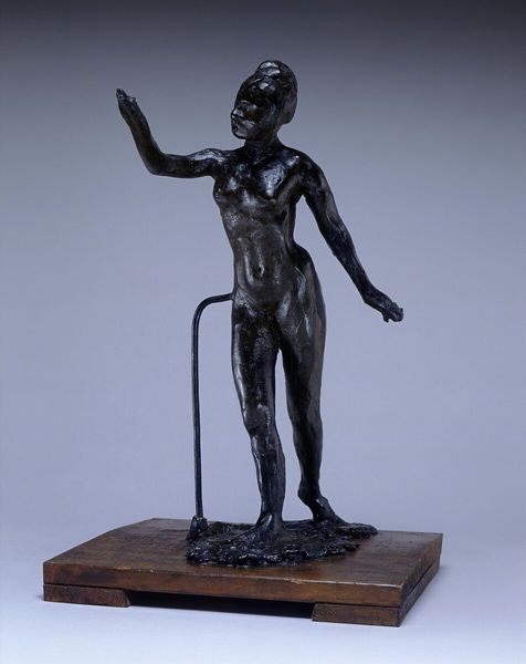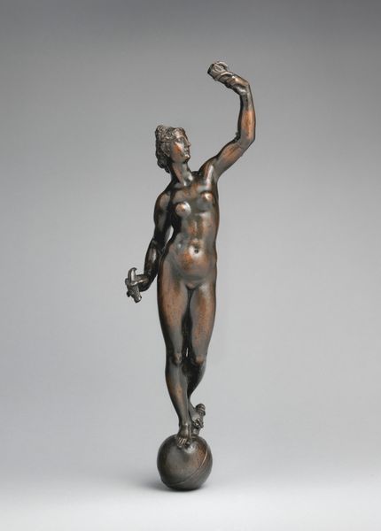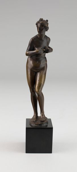 This is a bronze sculpture of Venus, its maker is unknown. The initial impression is one of classical composure, yet there is a palpable tension between the rigid, symmetrical pose and the soft, organic forms of the body. The surface texture of the bronze is crucial; it catches and refracts light, lending a sense of movement to the figure. The sculpture's composition follows a clear vertical axis, stabilized by the square base. Yet, the outstretched arm disrupts this symmetry, creating a dynamic counterpoint. This gesture prompts us to consider the sculpture in terms of semiotics – what does this offering signify? The smooth skin contrasts with the stylized hair and wreath, perhaps hinting at the divide between nature and culture, a common theme in classical art. Ultimately, the beauty of this artwork lies in its formal equilibrium and its ability to provoke thoughtful interpretation, destabilizing any singular meaning we might initially impose. The way the light plays across the bronze's surface is not merely aesthetic, but also an integral part of its symbolic language.