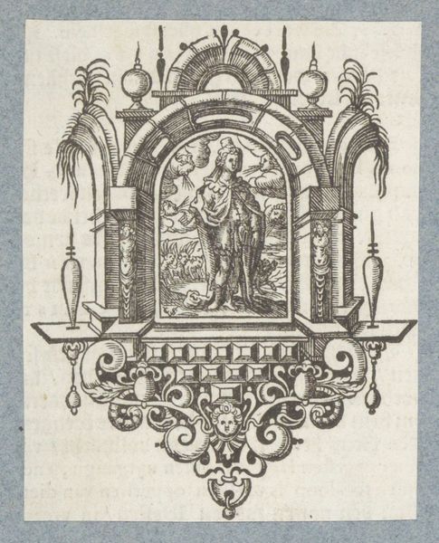 This is Theodor de Bry's "Ornament for Knife Handle," an etching made in the late 16th century. The design exhibits a vertical hierarchy of ornate motifs, each meticulously detailed with fine lines that bring depth to the metalwork it simulates. The composition balances symmetry with the organic forms of figures and foliage, creating a visual rhythm that guides the eye. The etching employs a semiotic language common in its time. Putti, symbolic of divine love, mix with scenes of marriage and heraldry. This blend represents the union of worldly and spiritual values associated with marriage and family. The rigid structure of the knife handle is thus destabilized by the incorporation of fluid, lifelike figures. De Bry's intricate design emphasizes the functional object, transforming it into a carrier of cultural and philosophical ideas about love, fidelity, and social order. This etching not only demonstrates craftsmanship but also serves as a window into the values and symbol systems of the Renaissance.