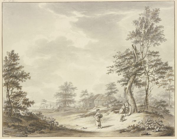 Curator: Let's take a moment to appreciate this pastoral scene titled "Waldausgang, rechts die Ruine einer Kapelle, in die ein Reiter hineinreitet," an eighteenth-century watercolor and tempera painting by Karl Franz Kraul, currently residing in the Städel Museum. Editor: My immediate reaction is how incredibly gentle it is. The colour palette is so soft, almost faded, and the figures are placed so carefully within the landscape. There's an overarching sense of peace and human insignificance in the face of nature. Curator: Yes, the artwork resonates with themes prevalent during that era, with the classicist movement, where idealised landscapes symbolized social harmony. Kraul’s attention to architectural ruins and everyday life illustrates his interest in documenting society and cultural heritage. Editor: The application of watercolor, particularly, speaks volumes. Look at the almost translucent washes, building depth through layering. This wasn't just about depicting a scene; it was about exploiting the very properties of the medium. How accessible were such refined materials and the skills needed? What was the artist’s relationship to production? Curator: Access to materials would reflect the artist's social standing and patronage networks. Wealthier artists, supported by the elite, had more resources and freedom to experiment with finer materials and detailed craftmanship. The emphasis would also be on training and the establishment of formal institutions. Editor: But think about the labour embedded within it. Where were these materials sourced, how were they processed, and what were the working conditions of the artisans that contributed to making it possible? These idyllic images often cloak very complicated and asymmetrical structures. Curator: Indeed. While the image presents a seemingly serene landscape, we can interpret it through a socio-political lens. We might consider who these figures in the artwork are and their implied social hierarchy, perhaps exploring connections to issues around labor or power at the time the art was produced. The ruin could symbolise broader political and institutional decay, inviting interpretation of the artist's own context. Editor: The ruins feel important—the work of time and labour eroding. What endures, and what fades away? Curator: Ultimately, what is remarkable is that a relatively humble tempera on paper has persisted for so long, affording us a view into a specific past moment. Editor: A testament to its material legacy—though how we choose to read its complex social texture today inevitably colours our understanding.
