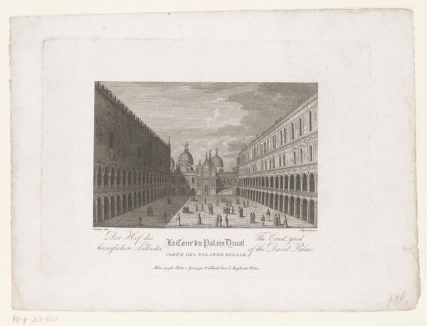 Editor: This engraving, "Gezicht op de Pont Notre-Dame te Parijs," by Jean Marot, was created in 1662. The detail is astounding; it gives me the impression of peering down a never-ending corridor. What visual elements stand out to you? Curator: The rigorous application of linear perspective immediately commands attention. Observe how the receding lines of the buildings converge toward a vanishing point, creating a powerful illusion of depth on a flat plane. Editor: Yes, it’s very precise, but it almost feels… exaggerated? Curator: Indeed. Consider the treatment of architectural form. Marot meticulously renders the facades with repetitive geometric elements. The rhythmic succession of arches and pointed roofs establishes a pronounced visual order, yet also risks monotony. Editor: I see what you mean. The rigid structure is softened slightly by the figures populating the space. Do they contribute to the overall composition? Curator: Certainly. Though diminutive, these figures activate the foreground, providing scale and a sense of bustling urban life. However, note their somewhat stylized representation; they serve more as compositional accents rather than individualized portrayals. Ask yourself what effect this contrast in detail generates? Editor: It sets off the imposing architecture, amplifying the sheer scale of the bridge. I also see now how the clouds’ swirling lines soften the scene's sharp edges, generating dynamic tension with the strictly ruled geometric solids. Curator: Precisely. By balancing orthogonal structures with such organic touches, Marot avoids pure formalism, inviting a more nuanced appreciation of this urban vista. Editor: This analysis highlights elements of design that I missed initially; thanks, I appreciate this breakdown!