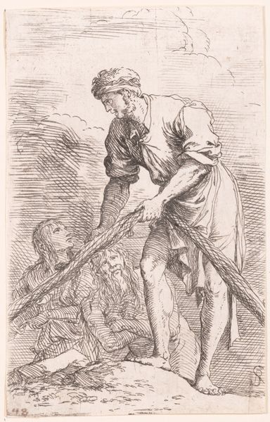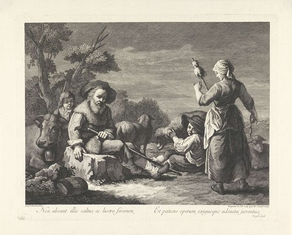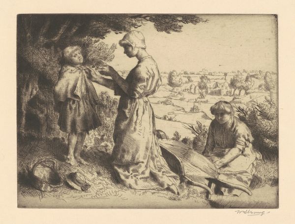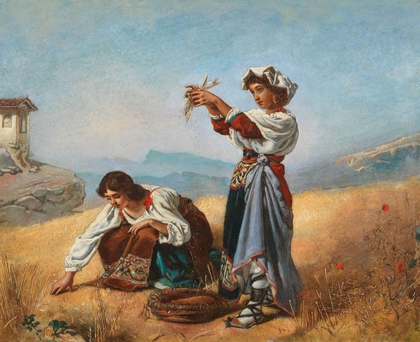 Editor: Here we have George Frederic Watts' "Ruth and Boaz", currently held at the Tate. The composition strikes me as quite interesting, especially how the figures are arranged within this amber landscape. What do you see in this piece? Curator: Focusing on its formal qualities, observe the arrangement of figures, the interplay of light and shadow. Consider how Watts employs color to create depth and hierarchy. Note how the artist created this sketch with implied lines and a compressed plane. What do you make of the tonality? Editor: I notice a definite contrast. The darker figures in the foreground seem separated from the lighter ones behind. Curator: Precisely. The structure invites close examination of how form dictates our perception of the narrative itself. Ultimately, the artist utilizes the structure of painting to explore philosophical and theoretical questions. Editor: Thank you. I hadn't considered how much the composition contributes to the emotional impact. Curator: Indeed. It's the careful manipulation of form that elevates the work beyond mere illustration.