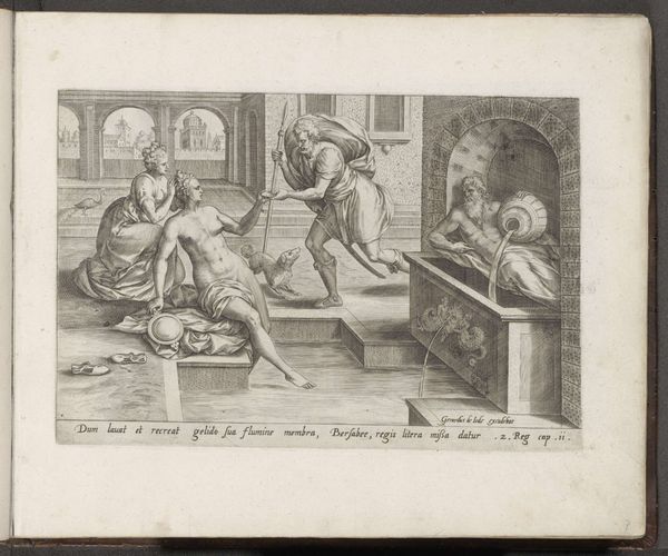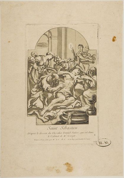 Curator: This engraving, attributed to Francesco Faraone Aquila and created sometime between 1686 and 1740, is titled "Pest." It presents a scene I find simultaneously unsettling and fascinating. Editor: Oh, immediately what strikes me is how it captures a very specific feeling—suffocation. Not just physically, but this weighty atmosphere of despair, almost like a collective trauma frozen in ink. Curator: Absolutely. You've put it beautifully. Note how Aquila uses the medium itself—the precise, controlled lines of the engraving—to create this sense of… well, constriction. It feels incredibly deliberate. You see the prostrate figures in the foreground, almost sculptural in their stillness. Editor: Right, there’s almost a tableau vivant aspect to it. Are they mourning? Praying? There's also the tension between the classical references and the palpable horror—the bust in the background juxtaposed with what looks like people succumbing to plague. The artist, it seems, is pointing to the frailty of systems and the vulnerability of the body. Curator: The details are really impactful—the person fumigating with the torch, the huddled figures. Are they seeking divine intervention or just desperately trying to ward off infection? Also the animals are dead, or sick... Editor: Which begs the question, whose narrative is prioritized? This looks like an attempt to maybe showcase power, through a religious figure. Perhaps a narrative aiming for future glorification despite the presence of decay and systemic collapse. It speaks to enduring tensions surrounding authority, illness, and socio-economic factors in shaping societal responses. Curator: An excellent point. The inscription definitely alludes to papal patronage. One can easily become preoccupied by the spectacle of suffering, but looking at it through this light… It opens up other meanings and implications. What do you think about its continuing impact now, looking at these historical pandemics reflected? Editor: Absolutely—"Pest," even now, asks critical questions. How do we represent collective trauma, who gets to speak for the suffering, and how does art both reflect and shape our understanding of these catastrophic moments? Also: it encourages a reflection on art's capacity to act as social commentary. It's an invitation to learn about inequities while urging conversations across historical, political, and social lines. Curator: Very well said! Yes, I see it as less a depiction of a single event and more of a testament of shared humanity and reflection of current experiences.