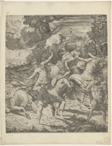 Domenico del Barbiere created this print, "The Stoning of Saint Stephen," sometime between 1541 and 1565. It depicts the biblical story of Saint Stephen, the first Christian martyr, being stoned to death for his faith. During the Renaissance, religious narratives were often used to convey not just spiritual messages, but also political and social commentary. In this work, the serene acceptance of Stephen contrasts sharply with the brutal actions of his stoners. One is forced to consider how the persecution and martyrdom of religious figures often become symbols of resistance against oppressive forces. Notice how Barbiere places the scene within a detailed landscape, complete with classical architecture. The city, with its gates and arches, situates the story in a specific time and place, adding to the emotional weight of the event. The figures above, bathed in light, seem to offer solace. This print serves as a reflection on faith, persecution, and the enduring power of belief in the face of adversity.